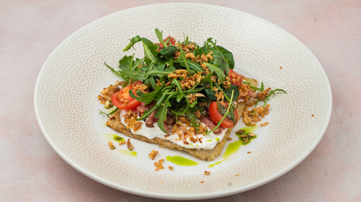 Potato rosti, smoked sour cream, crispy bacon, crispy onions, mixed salad (spinach, arugula, cherry tomatoes, olive oil)