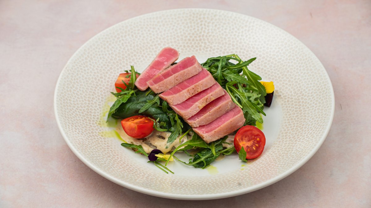 Rosti with tuna tataki, tonato sauce & salad mix