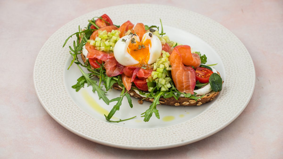 Toast with soft boiled egg, gravlax salmon, cream cheese & salad mix