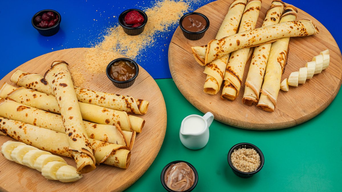 Domaće palačinke iz tiganja sa eurokremom i šumskim voćem, plus mogućnost dodavanja priloga. Brašno, jaja, 100% mleko, šećer, so, ulje