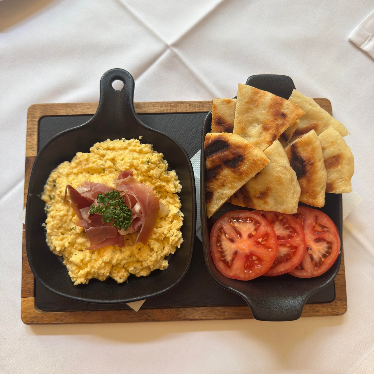 Prženice, kobasice, pečurke, pavlaka, 2 jaja na oko