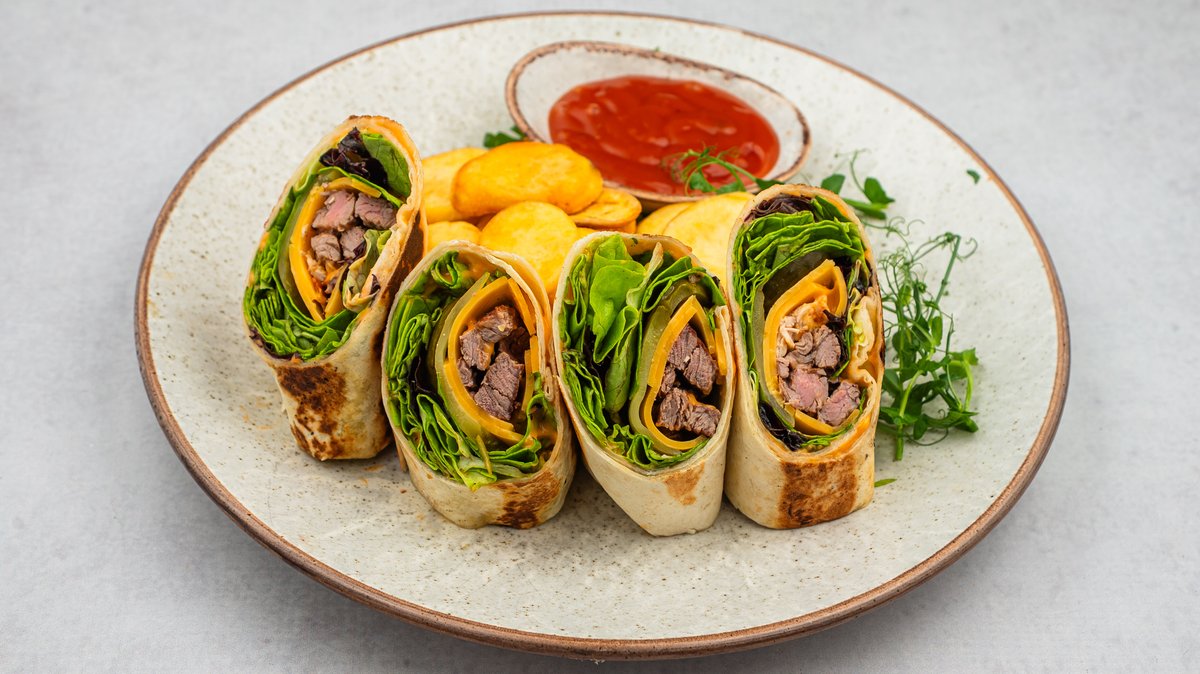 Tortilja sa grilovanim biftekom, miksom zelenih salata, čedar sirom, kiselim krastavičićima, burger dresingom i dolar čipsom