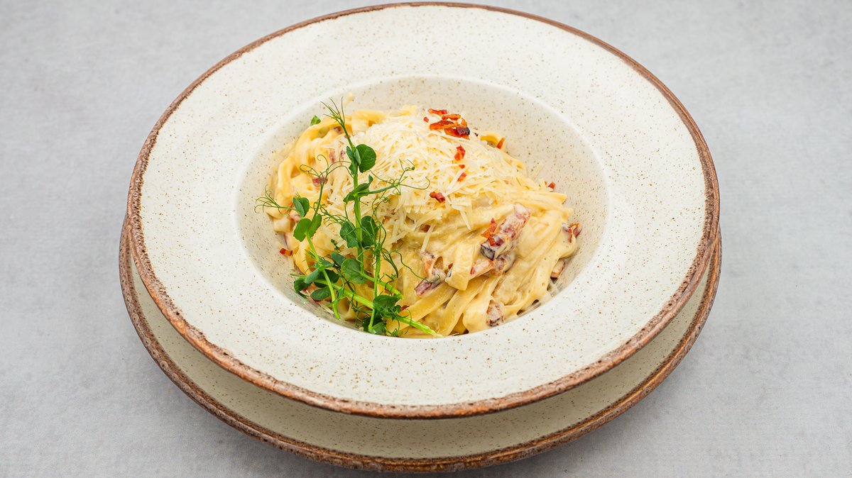 Taljatele pripremljene na tradicionalni način, u sosu od žumanaca, parmezana i crnog bibera, sa gronik slaninom