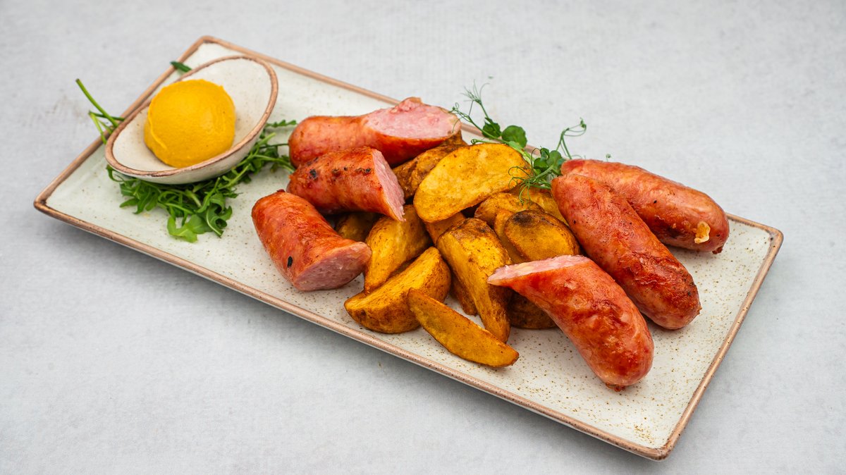 Grilоvаnа kоbаsicа sеrvirаnа sа dižоn sеnfоm i zаčinjеnim krоmpirоm