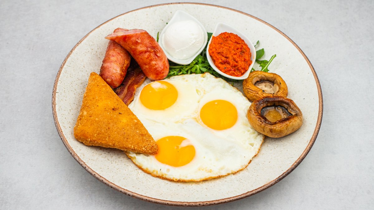 Jaja na oko, grilovana kobasica punjena sirom, grilovana slanina, ajvar, pavlaka, šampinjoni, pohovani kačkavalj