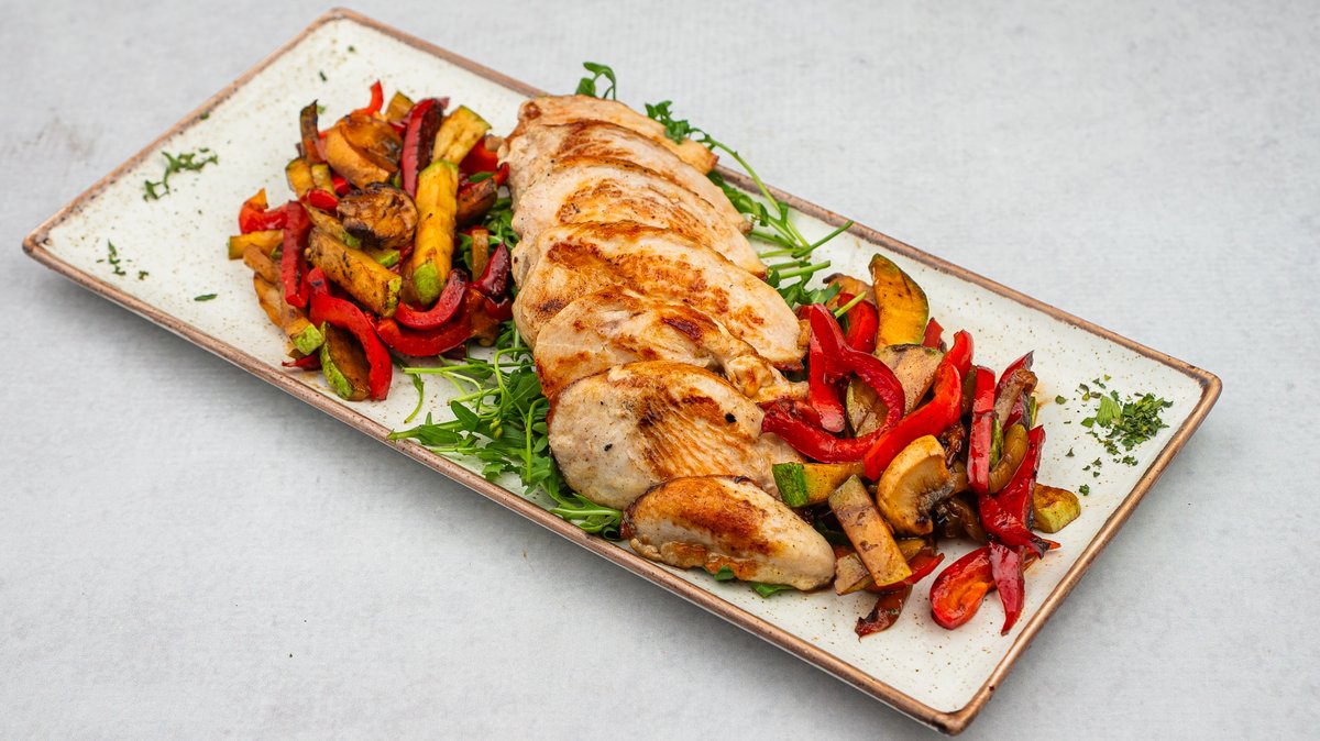 Grilovani pileći file sečen na taljatu, preliven maslinovim uljem, serviran sa grilovanim povrćem i brokolijem