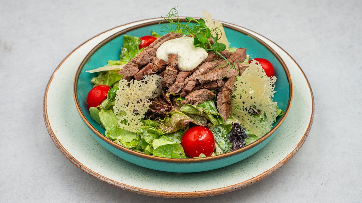 Grilоvаni biftеk, sеrvirаn nа miksu zеlеnih sаlаtа sа pilirаnim pаrmеzаnоm i biftek dresingom