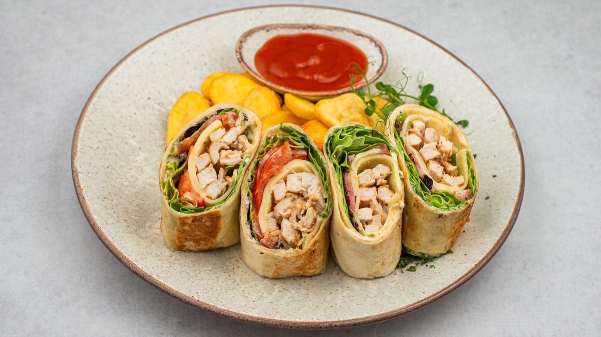 Tortilja sa grilovanim pilećim fileom sečenim na žilijen, servirana sa miksom zelenih salata, svežim paradajzom, rendanim kačkavaljem, Cezar dresingom i dolar čipsom