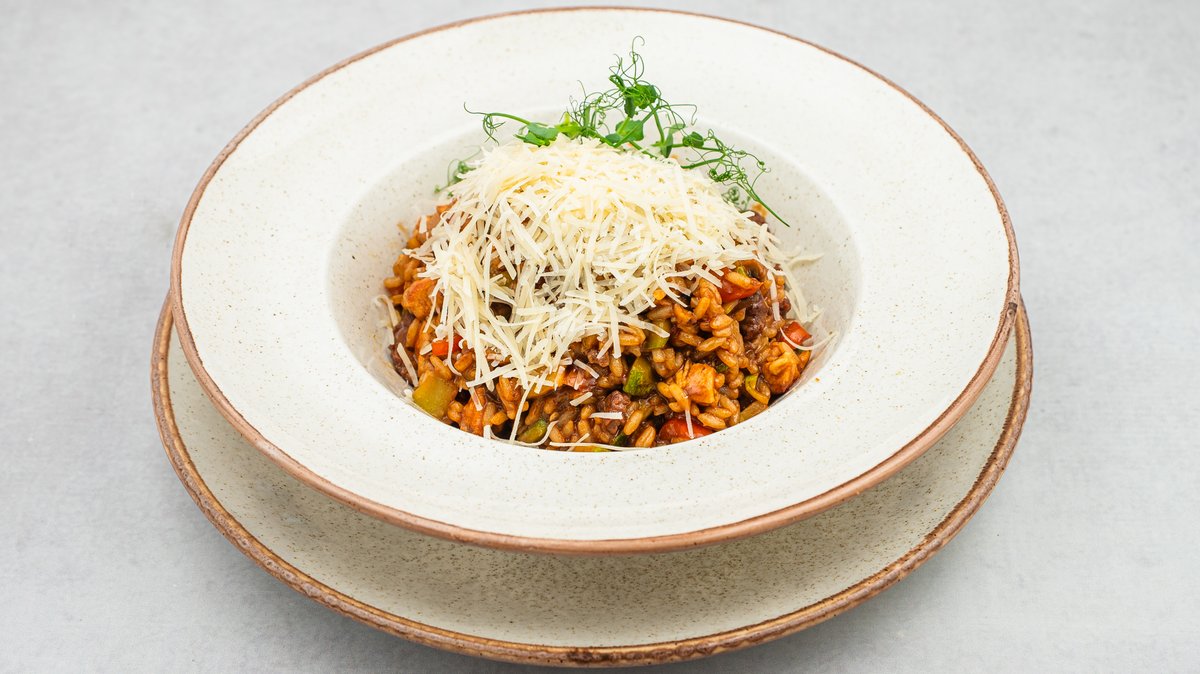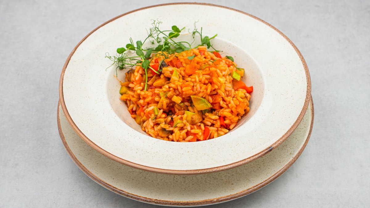 Arborio pirinač sotiran na puteru i crnom luku, pečurkama, paprikom, tikvicama, plavim patlidžanom i paradajz sosom