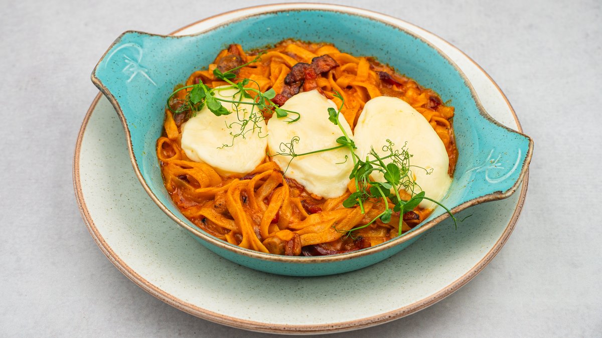 Taljatelje sa sotiranim vrganjima i pančetom na maslinovom ulju i belim vinom u sosu od neutralne pavlake, paradajza i peršuna, zapečene sa mocarelom i parmezanom