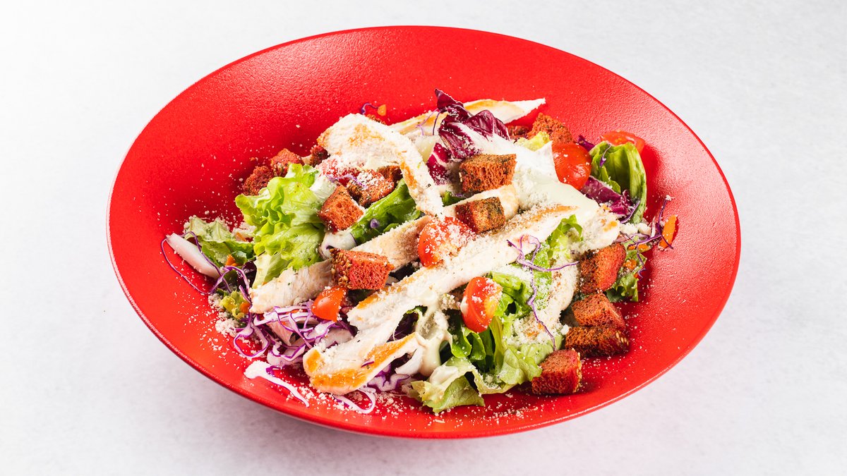 Pica testo, pančeta, jaje, pileći file, mocarela, cezar dresing, iceberg, paradajz, pomfrit