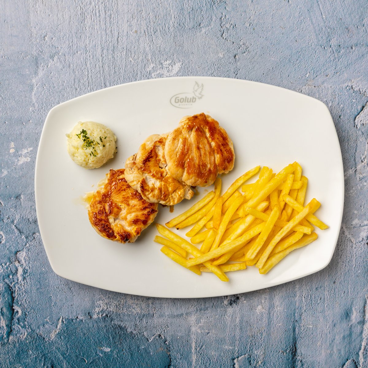 Oko 260gr, bez kostiju, bez kože. Prilozi: grašak, krompir, šargarepa, blitva