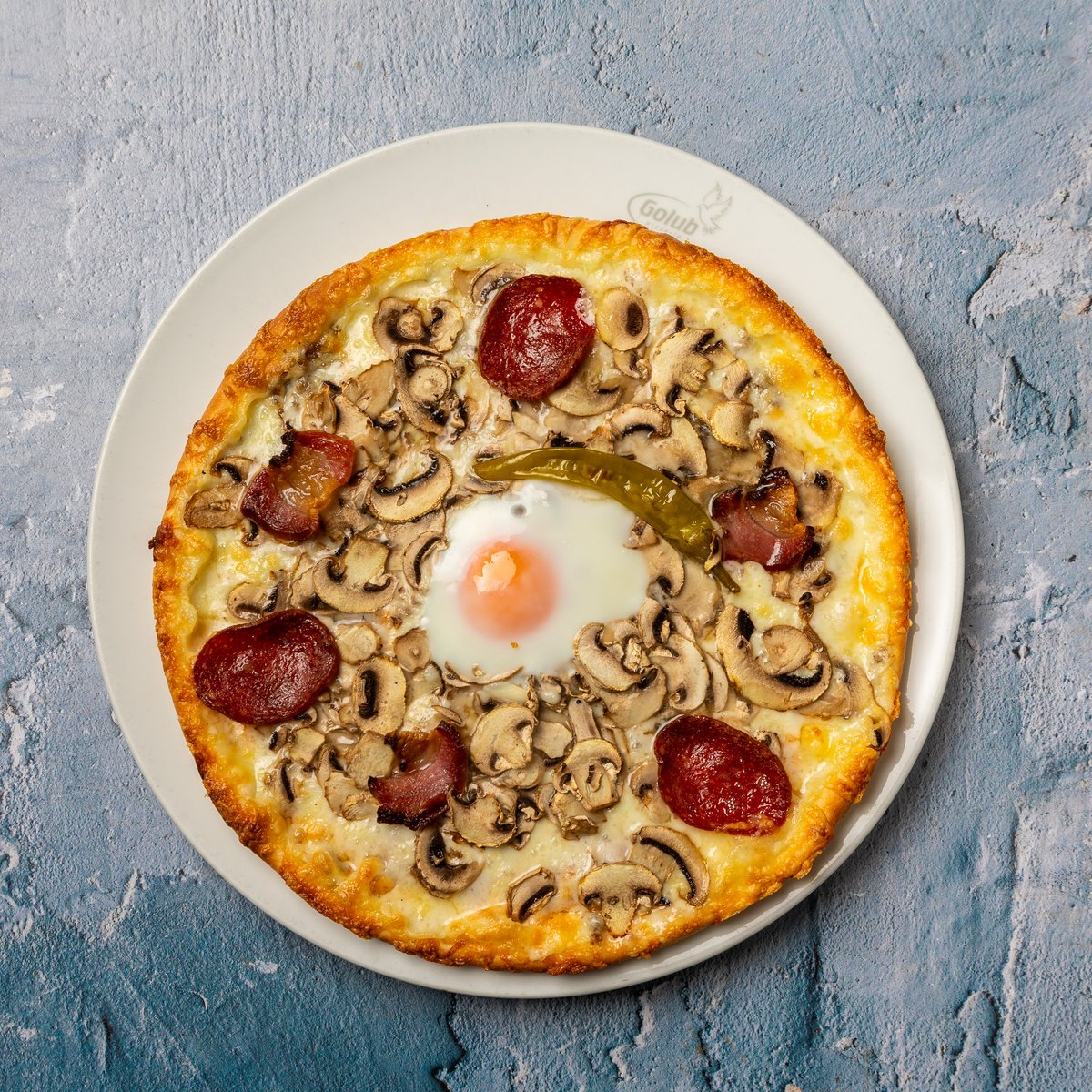 Testo, kečap, sir, šunka, zimska salama, jaje, masline