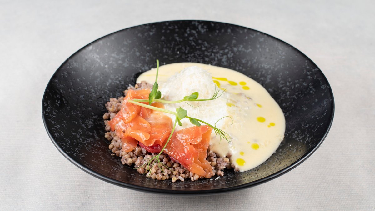 Zelena heljda, mus od parmezana, jaje poširano, dimljeni losos, rendani parmezan, mikrobilje, zeleni sos