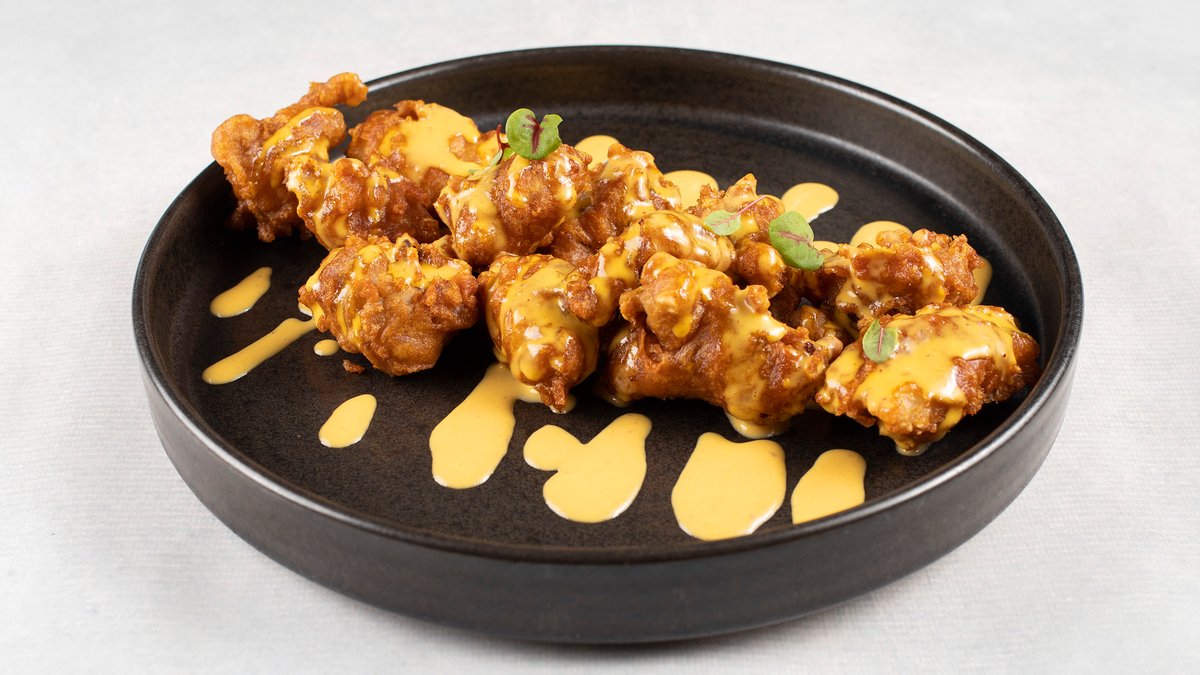 Pileći but, tempura, mango-čili majonez, zeleni sos, mikrobilje
