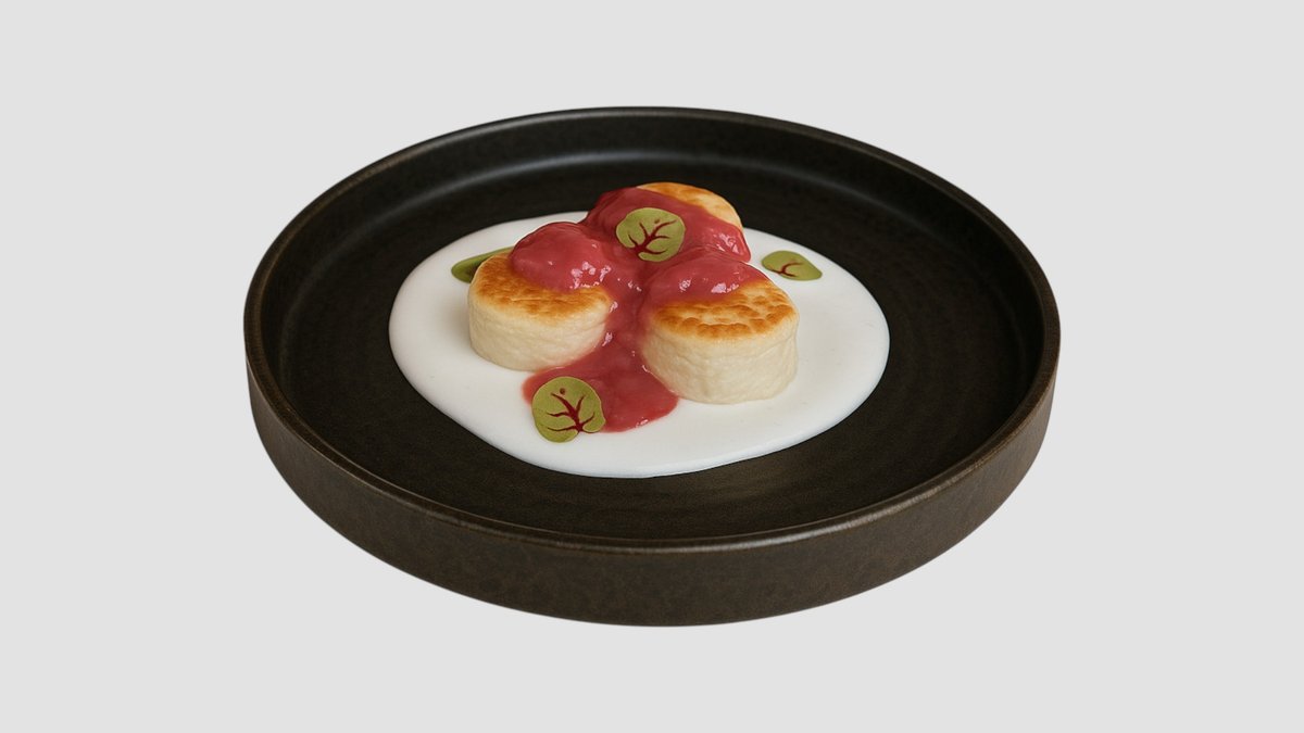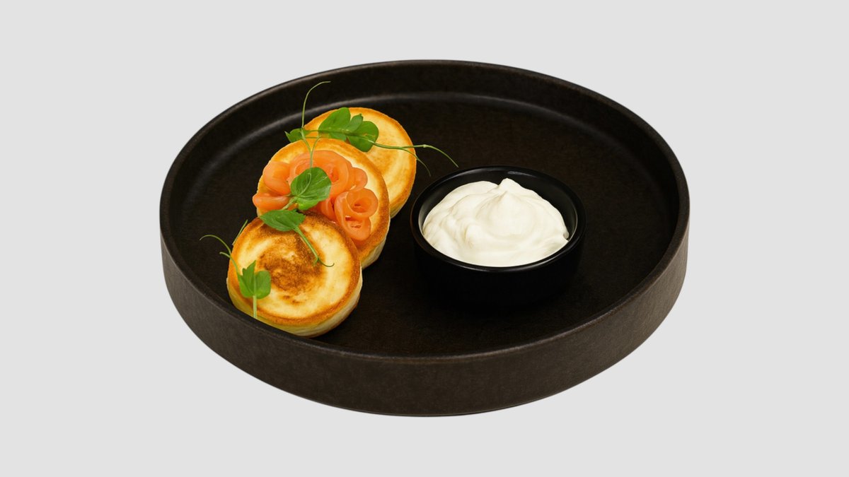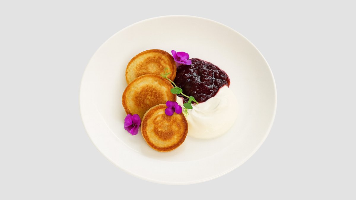 Syrniki, pavlaka, džem od mešanih bobičastih plodova, mikrobilje