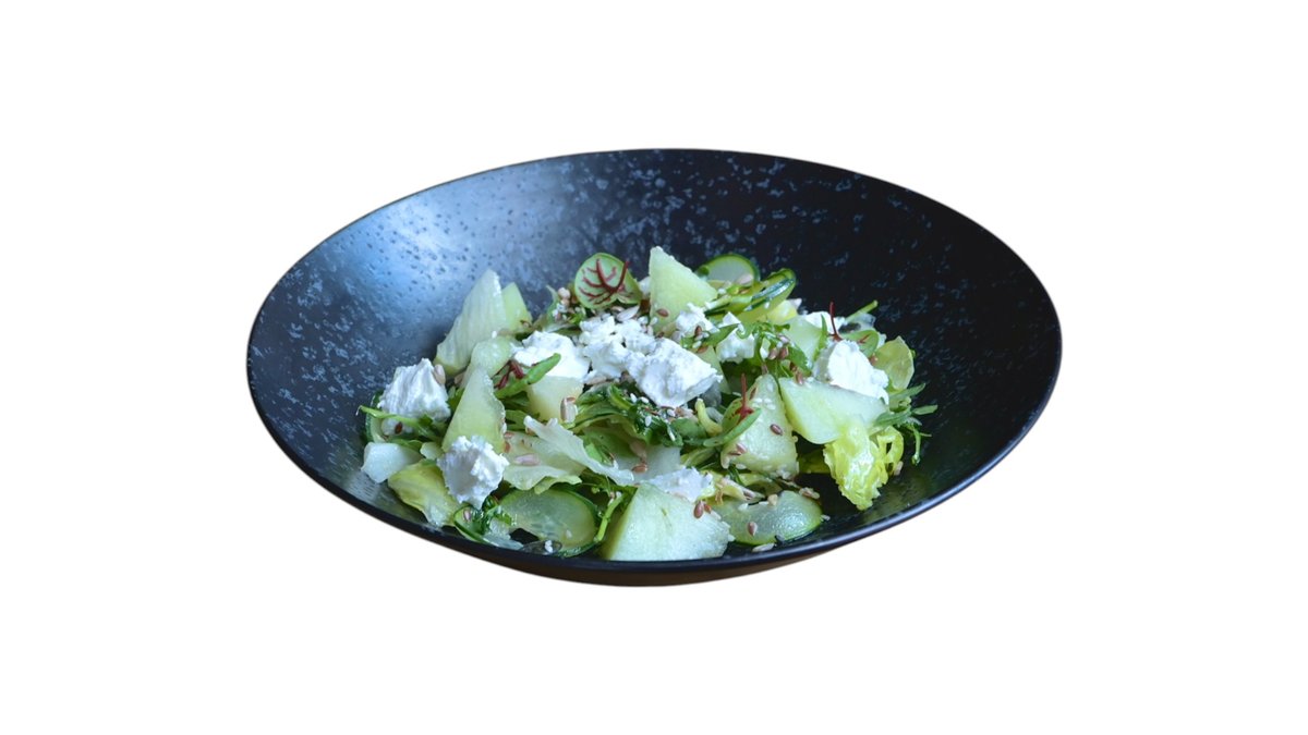 Svež krastavac, tikvica, ledena salata, avokado, jagode, mešavina salata, dresing za salatu, so, zeleni sos, feta sir, mešavina semenki