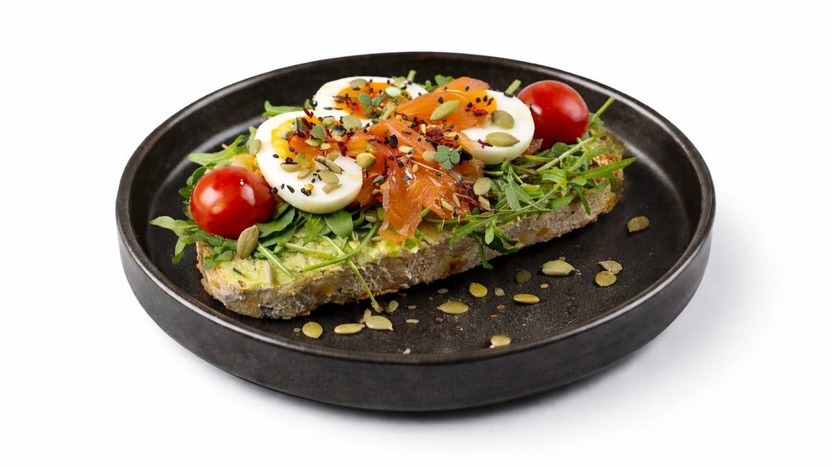 Hleb sa semenkama, Guakamole, jaja, losos soljeni, rukola, zeleno ulje, ceri paradajz