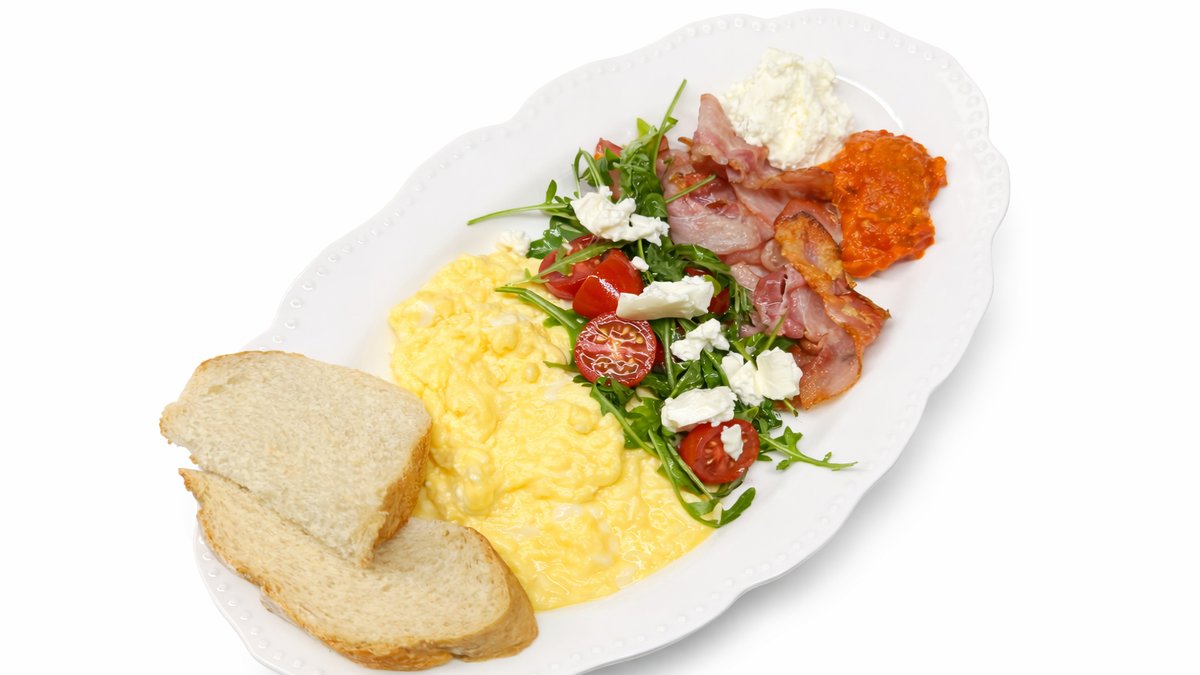 Jaja, pavlaka za kuvanje 20%, rukola, ceri paradajz, sir feta, hleb beli, ajvar blagi, kajmak namaz, panceta, maslac