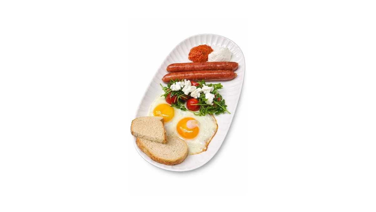 Jaje, kobasice, ceri paradajz, rukola, sir feta, hleb beli, ajvar blagi, kajmak namaz