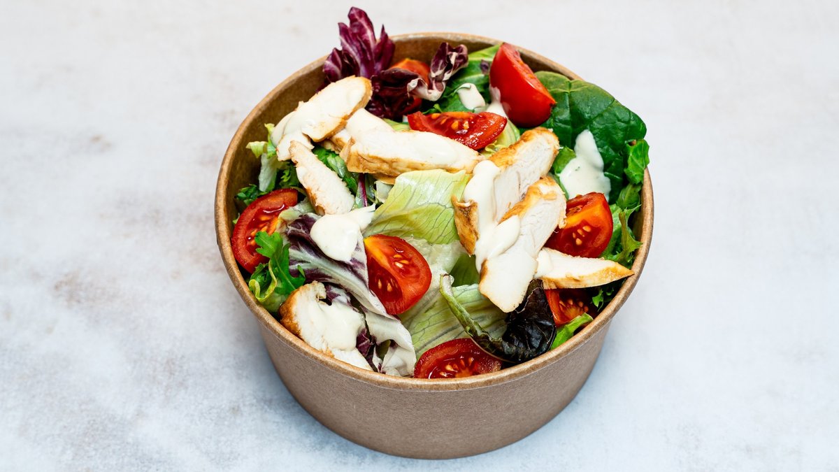 Marinirana piletina, iceberg salata, mix zelenih salata, cherry paradajz, krastavac, paprika, šargarepa, mango, maslina, dresing honey mustard