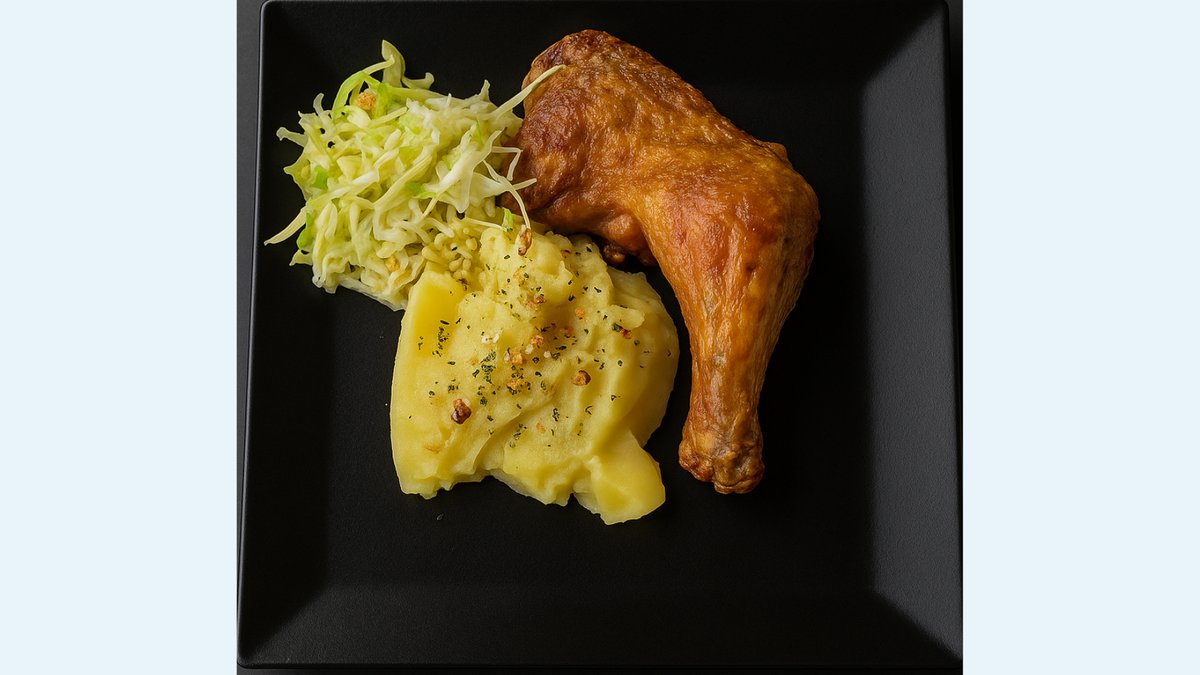 Otkošteni Pileći batak, povrće pečeno na ćumuru, beli pirinač, aromatizovani kupus