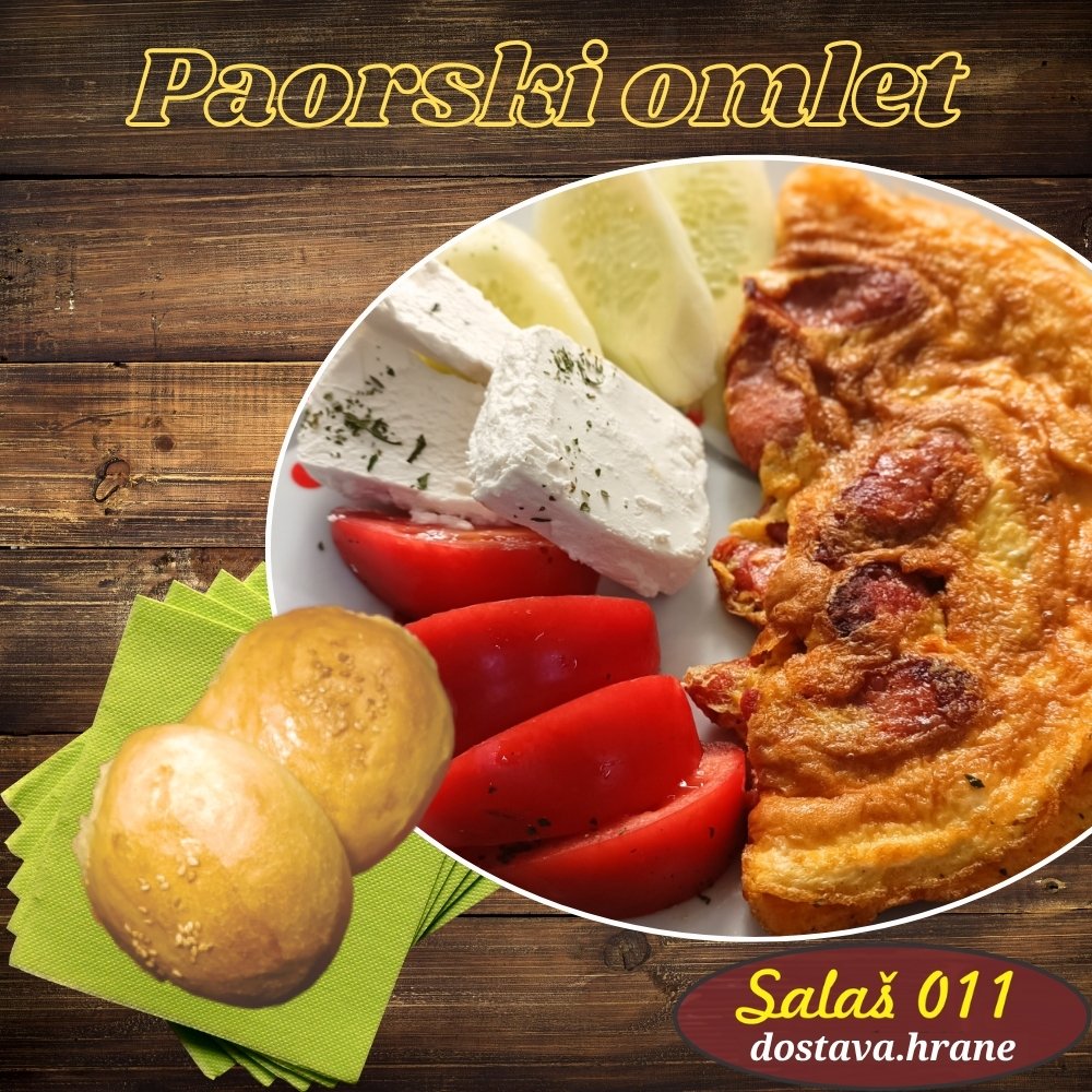 Omlet od tri jaja sa šunkom, povrćem (šargarepa, tikvica, pečurke, paprika), i kačkavaljem. Salata i mladi sir. Dve kajzerice.