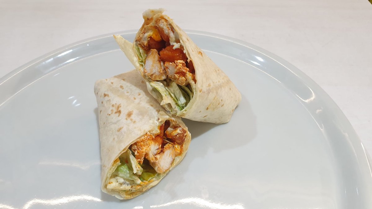 Schmizza dresing, komadići piletine u ljutom sosu, kačkavalj, ajsberg salata u tortilji
