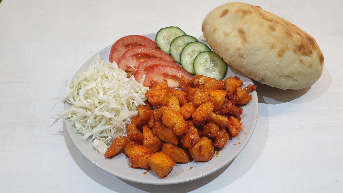 Komadići belog mesa (pohovani u schmizza pohu) u ljutom sosu sa kupus slatom, svezim krastavcem i paradajzom +Somun