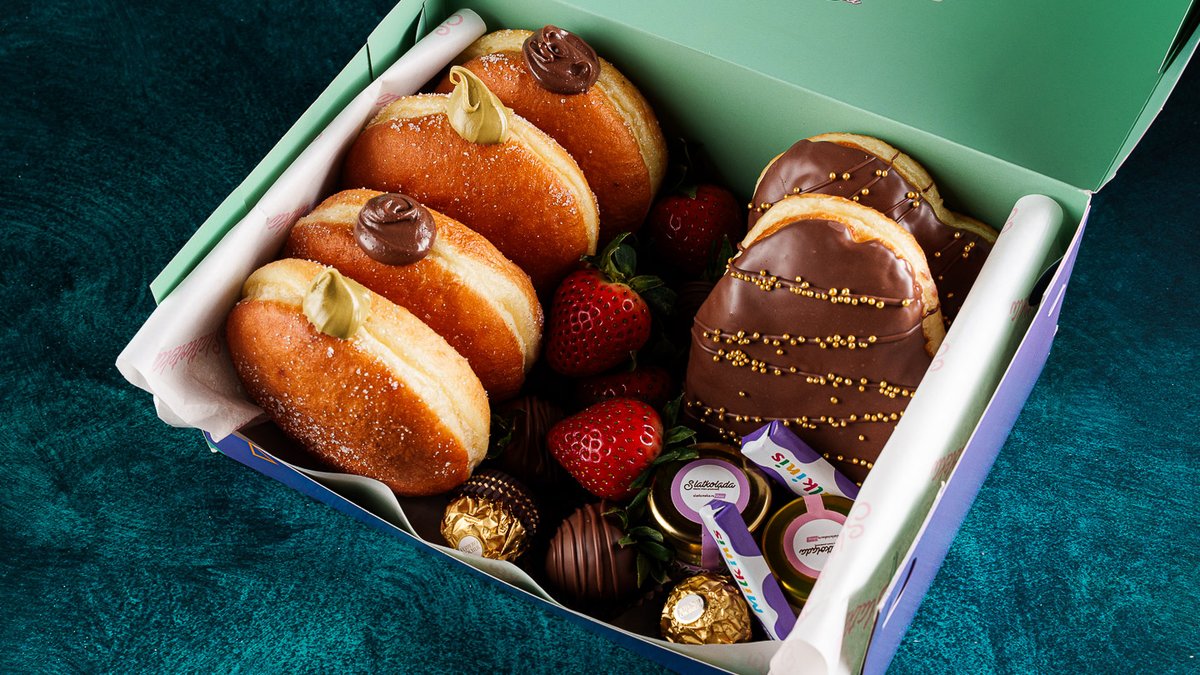 Mlečna čokolada, vanila fil, jagoda fil, malina, nana, bele čokoladne mrvice, smesa za krofne