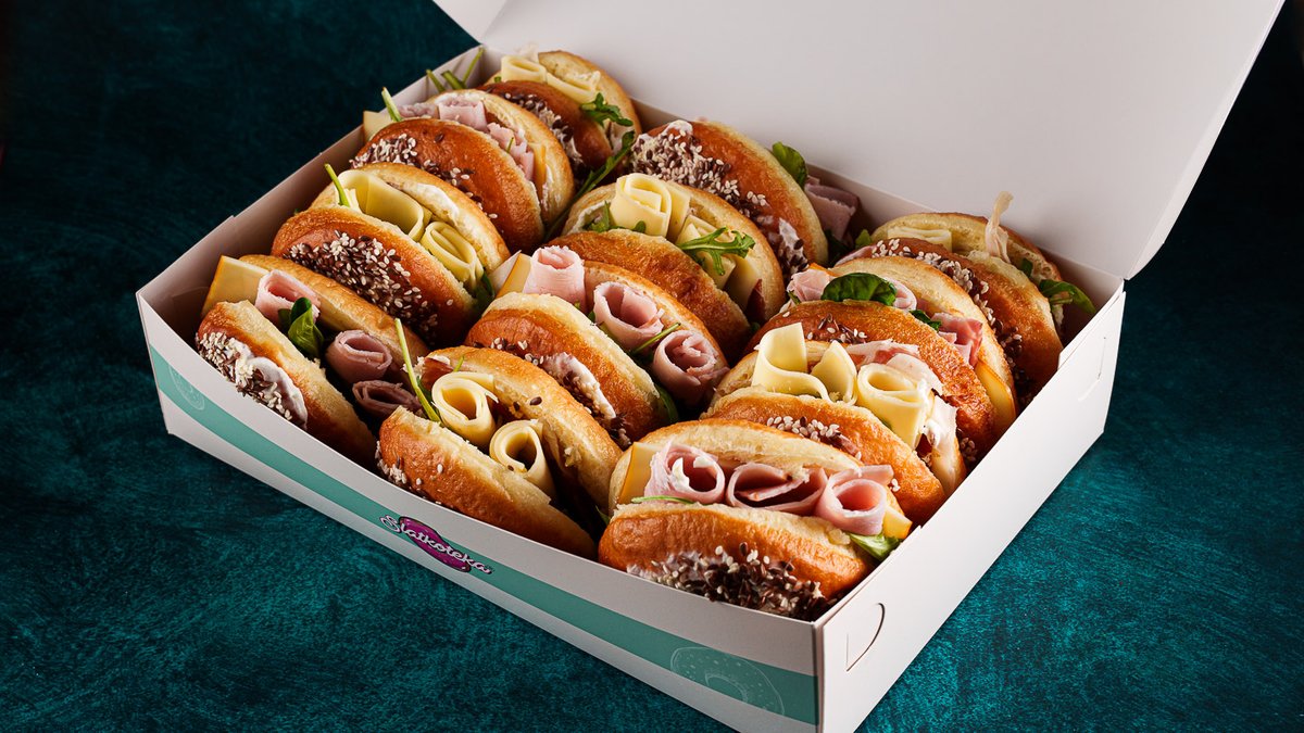 2 x Pršutica (susam, lan pršuta, sir maasdam, pesto sos, rukola, vajkrem i 2x Srpska krofna (dimljena pečenica, dimljeni kačkavalj, mustard sos, vajkrem, mix zelenih salata, susam, lan).