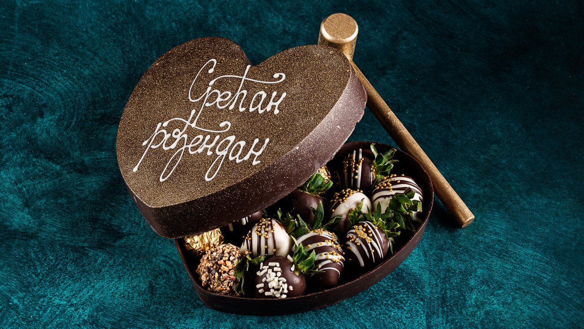 Srce iznenađenja sa porukom po želji (2-3 reči) krije jagode u čokoladi raznih ukusa, lupa se čekićem zlatne boje, 1kg