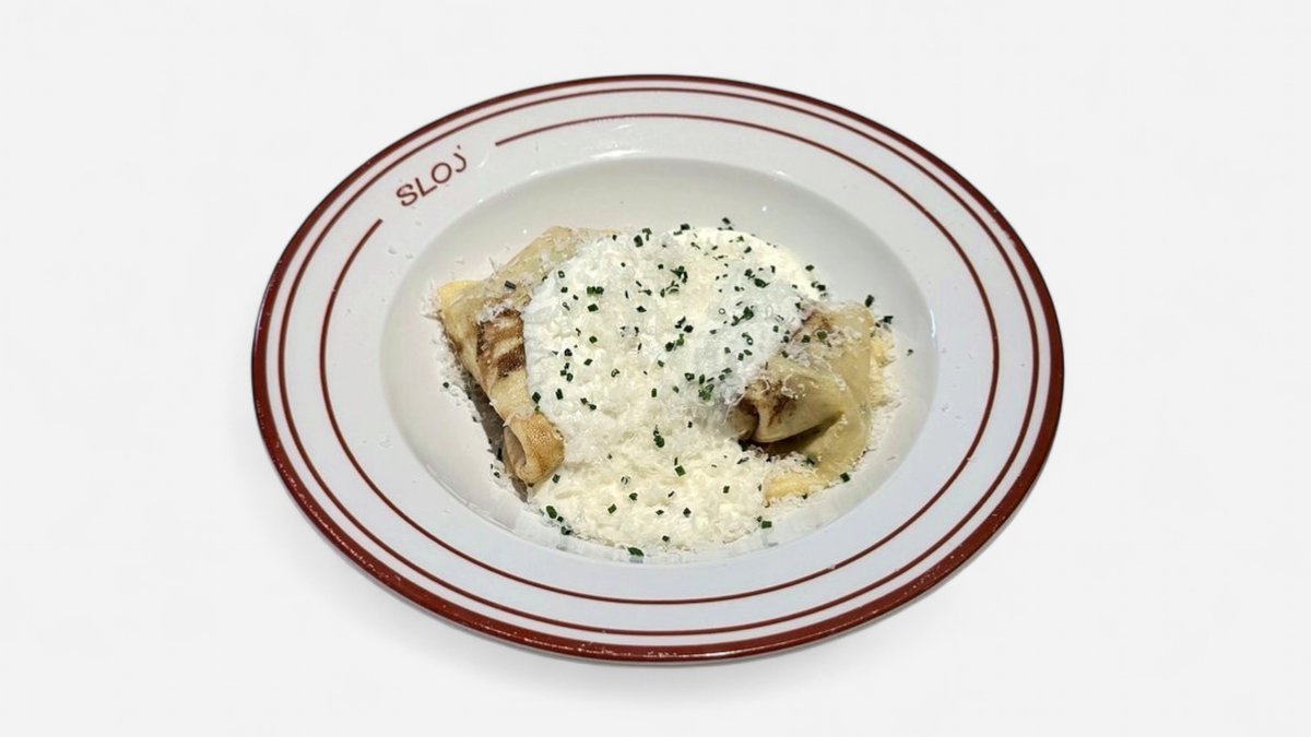 Lisnata pita sa nadevom od goveđeg ragua sa lukom, šargarepom, korenom celera, belim lukom i crnim vinom. Dopunjen krompir pireom, mocarelom, parmezanom, timijanom i crnim biberom.