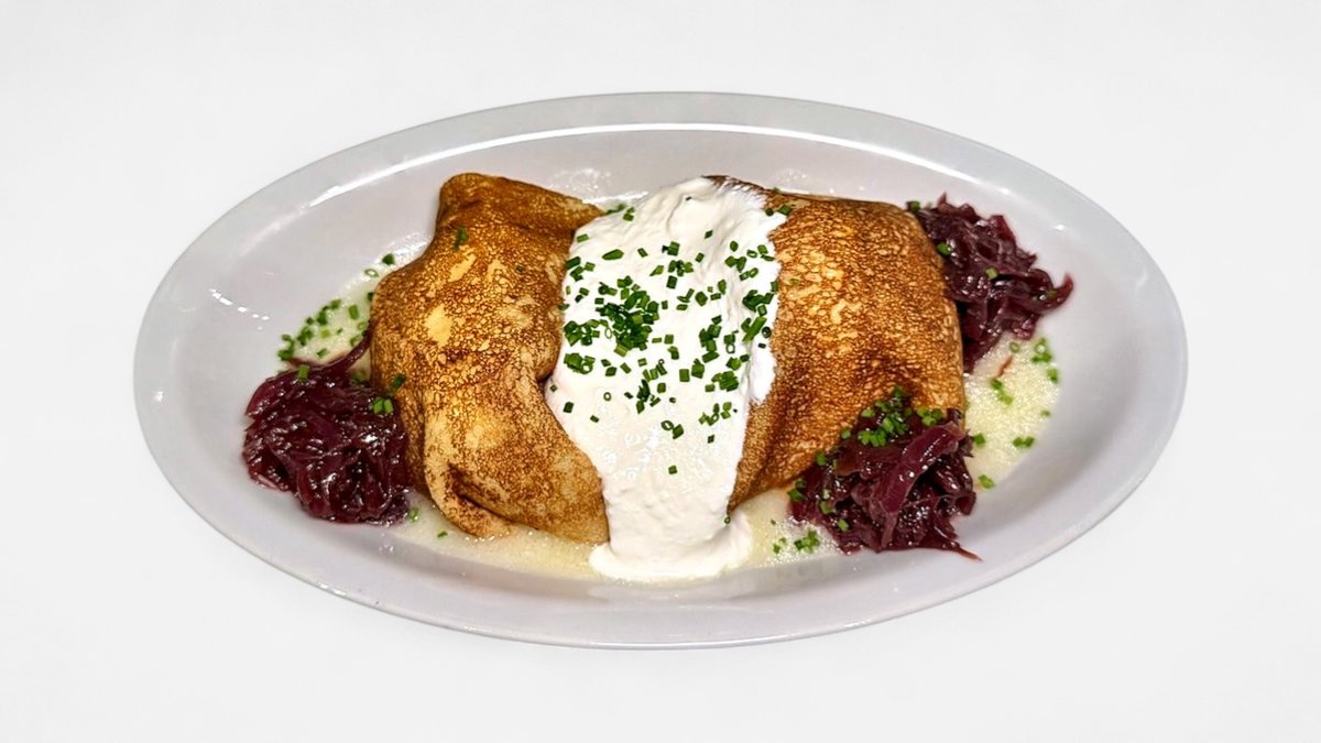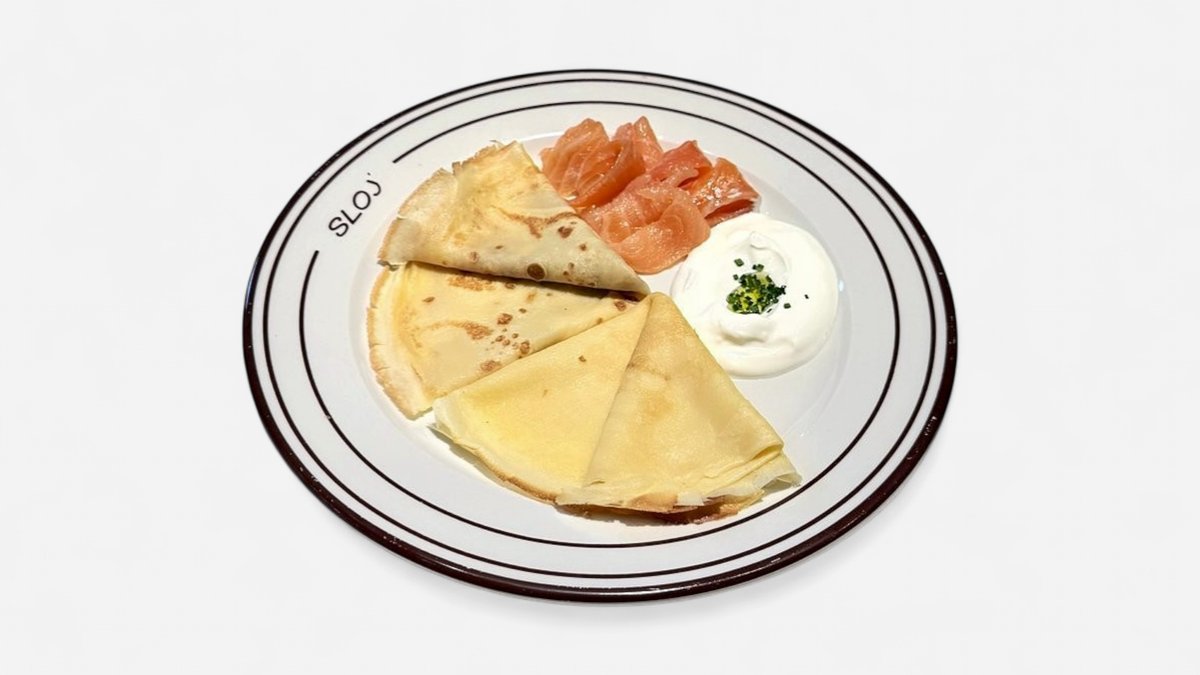 Palačinka od tikvice sa slaboslanim lososom, holandskim sosom i krem sirom. Služi se sa listovima spanaća. Prelivena citrusnim dresingom i maslinovim uljem