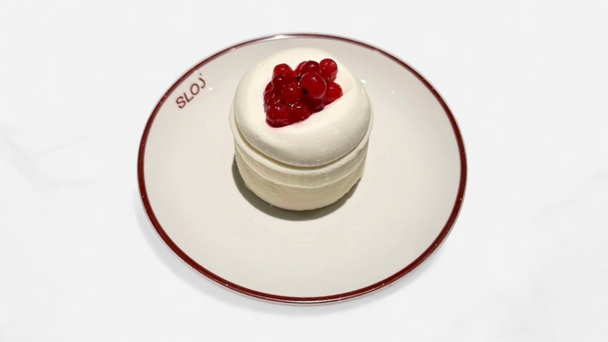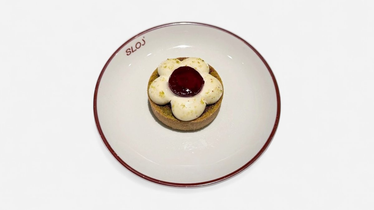 Dezert od slojeva usitnjenog pâte brisée testa sa vanila kremüom od bele čokolade i konfiom od crne ribizle, ukrašen šantili kremom od kisele pavlake i rendanim tonka pasuljem.