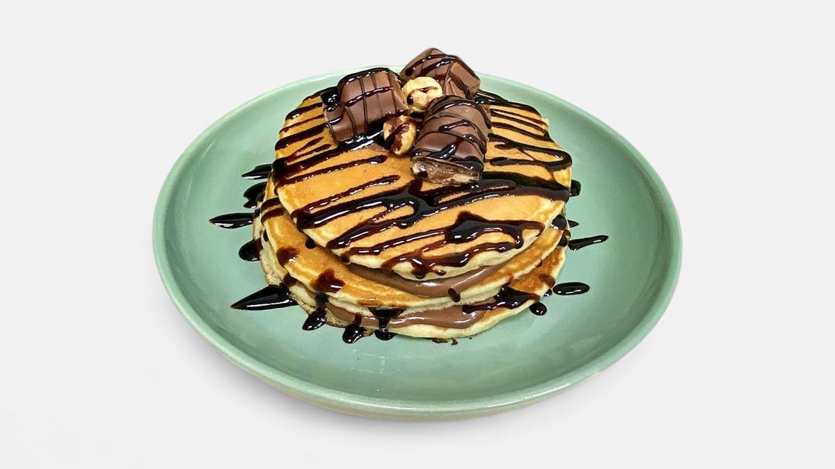 3 amerčke palačinke, nutele, lesnik , jedna kinder bueno čokoladica, preliv od čokolade