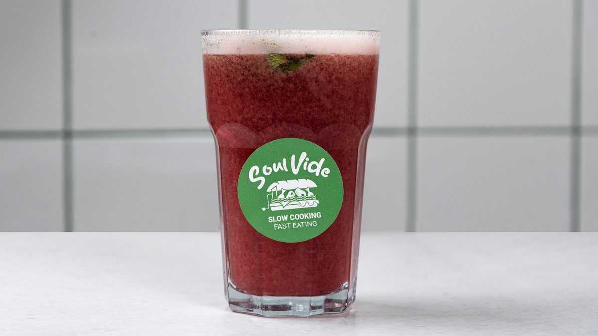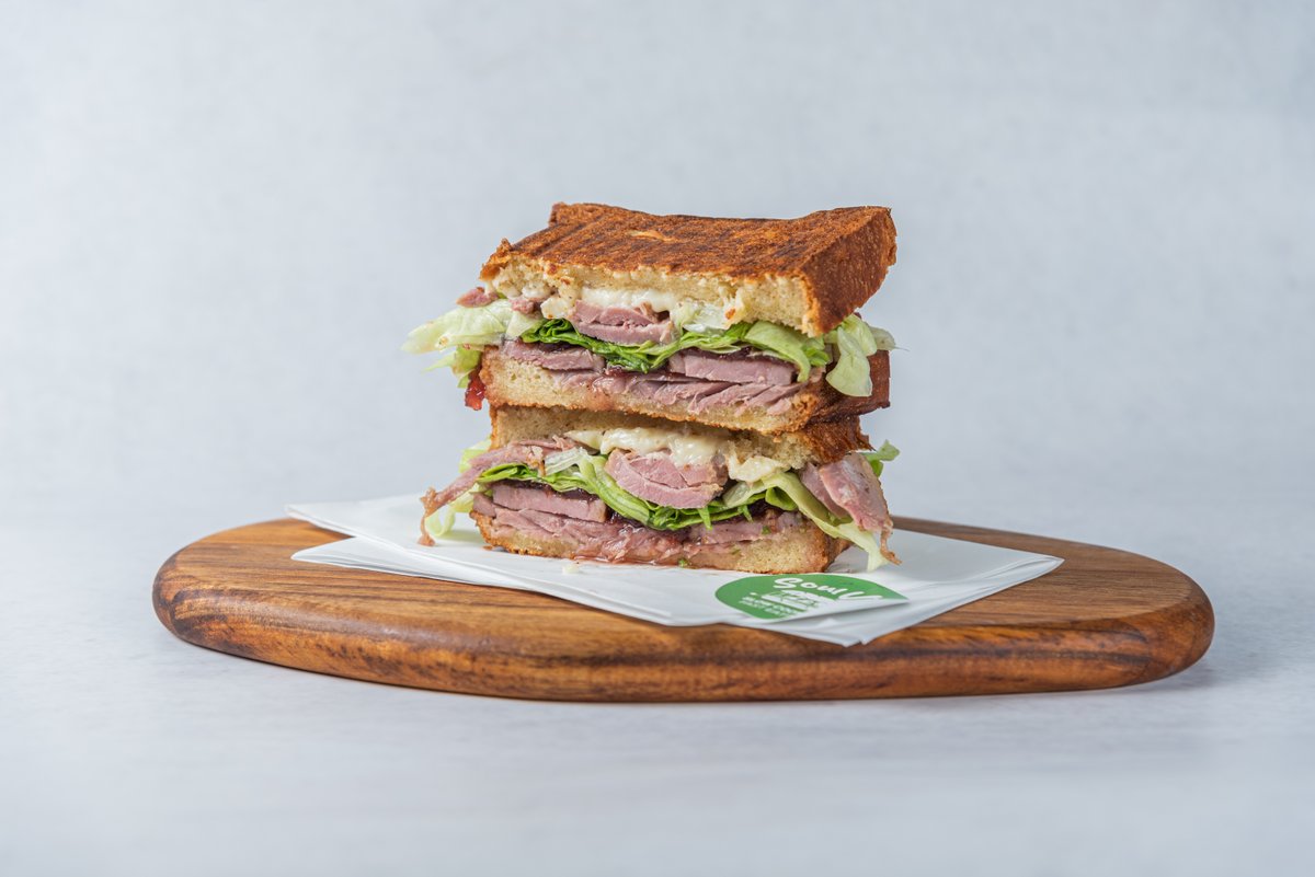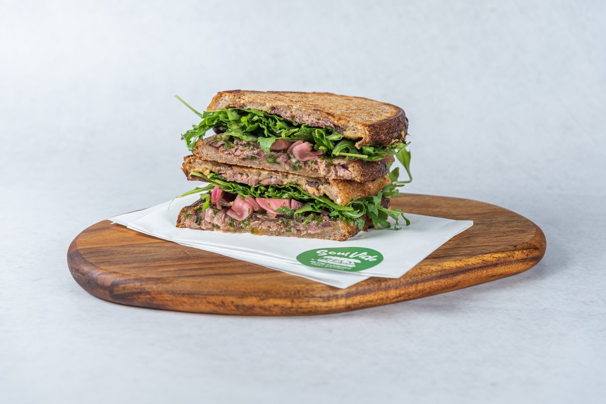 suvidirana junetina, gauda, čimičuri sos, ukiseljeni luk, rukola na hlebu od kiselog testa sous-vide beef, gouda cheese, chimichurri sauce with roasted peppers, pickled red onions, rocket salad, served in rye sourdough bread