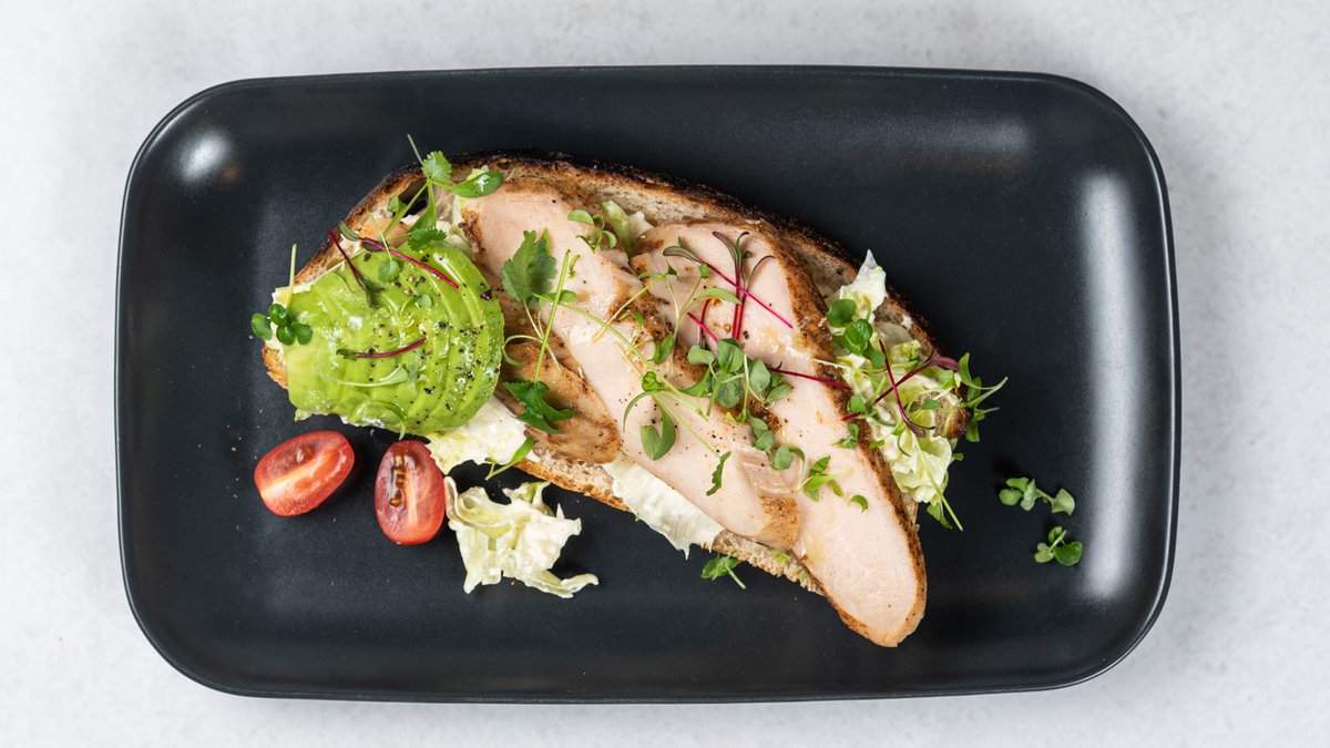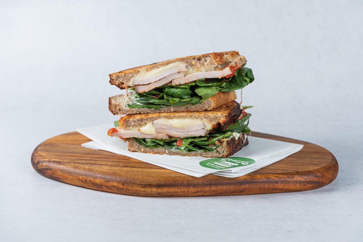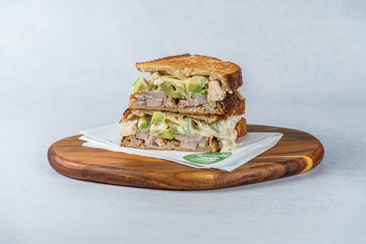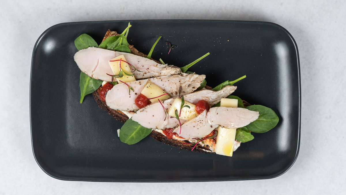 suvidirana ćuretina, mocarela, džem od paradajza, renč sos, spanać, služeno na hlebu od kiselog testa sous-vide turkey, mozzarella cheese, tomato jam, ranch sauce, baby spinach, served in rye sourdough bread