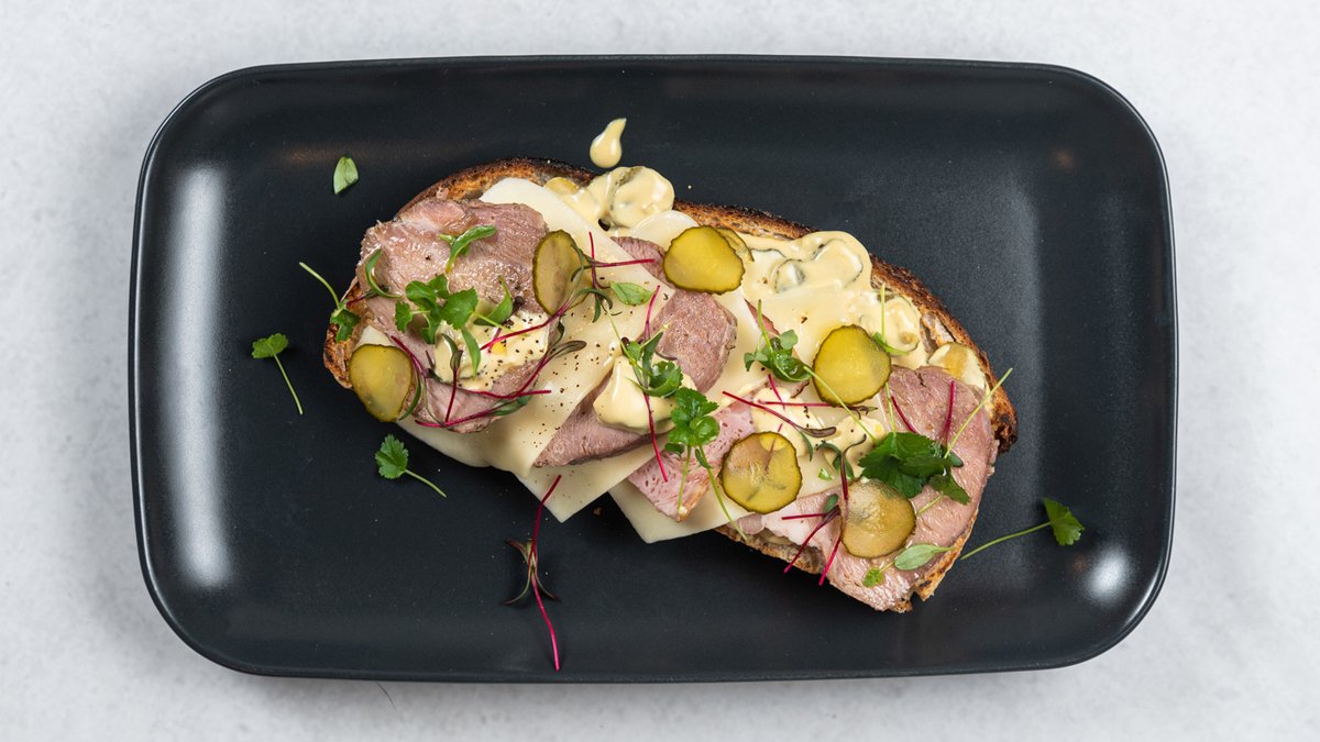 suvidirana svinjetina, šunka, ementaler, senf, kiseli krastavci na hlebu od kiselog testa sous-vide pork, ham, emmentaler cheese, mustard and pickles, served in sourdough bread