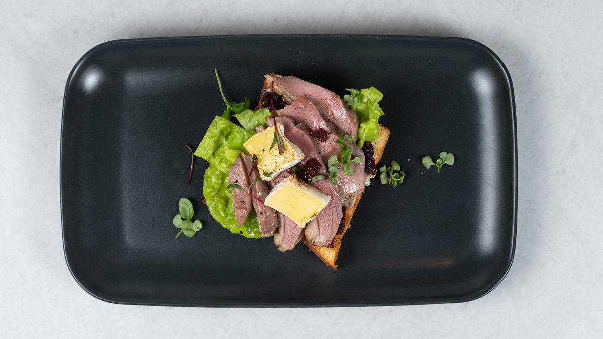 suvidirana pačetina, bri sir, sos od brusnice, sos od tartufa, zelena salata, služeno na hlebu od kiselog testa sous-vide duck, brie cheese, cranberry sauce, tartufata sauce, lettuce, served in brioche bread