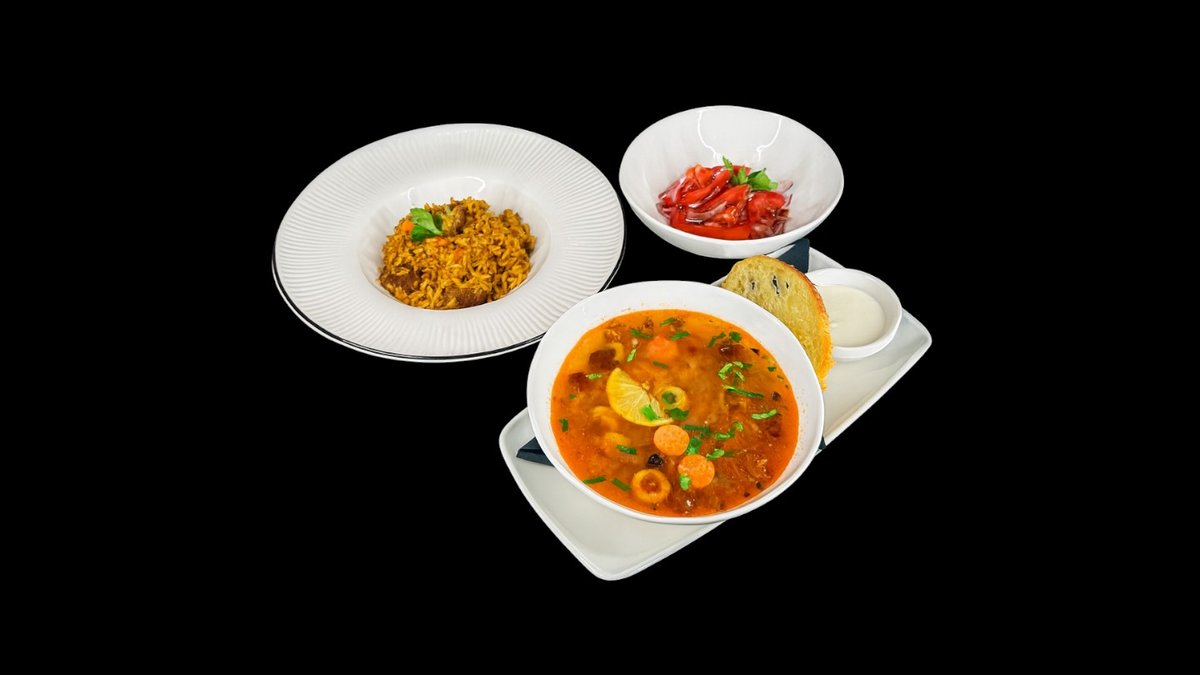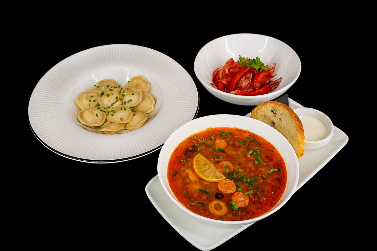 Combo lunch at a great price! Salad, soup, and a main course. Portion size: 800 g. Available at your table on weekdays until 5:00 PM.