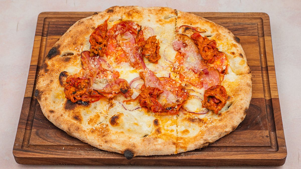 Mozzarella, ajvar, slanina, crveni luk, kulen, gorgonzola, parmezan