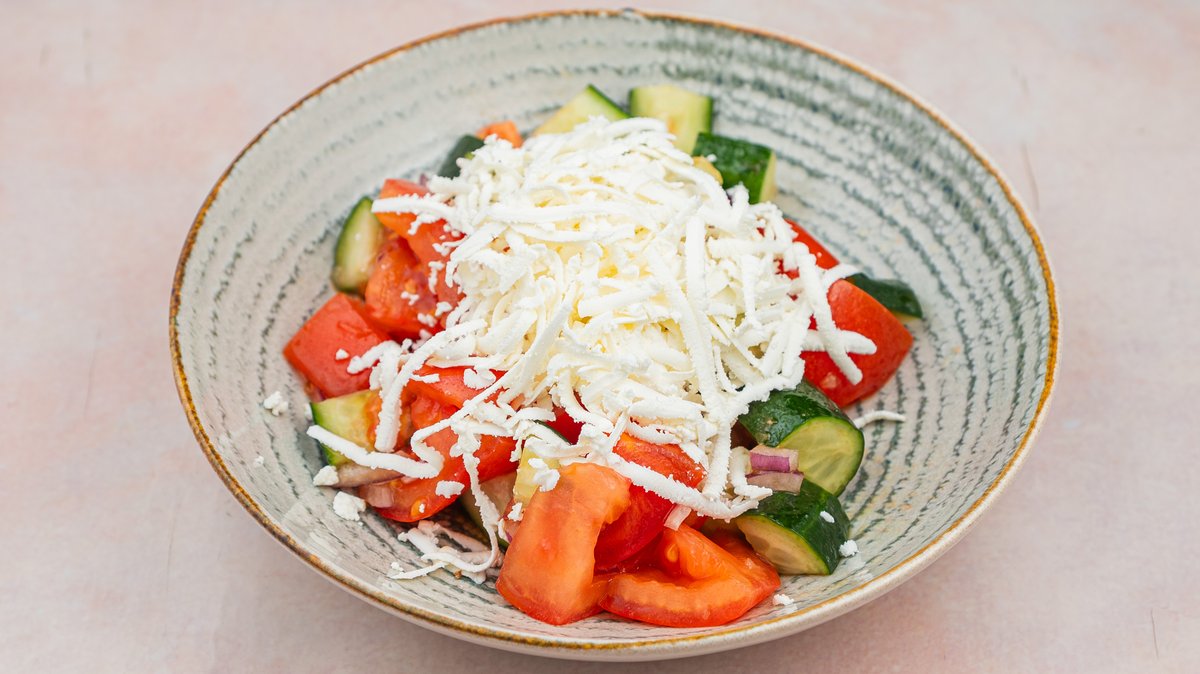 Biftek, susam, soja, med dresing, mix zelenih, čeri, paprika, kiseli krastavac, girlovana mozzarella,masline