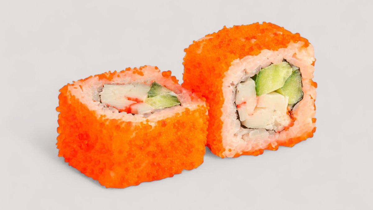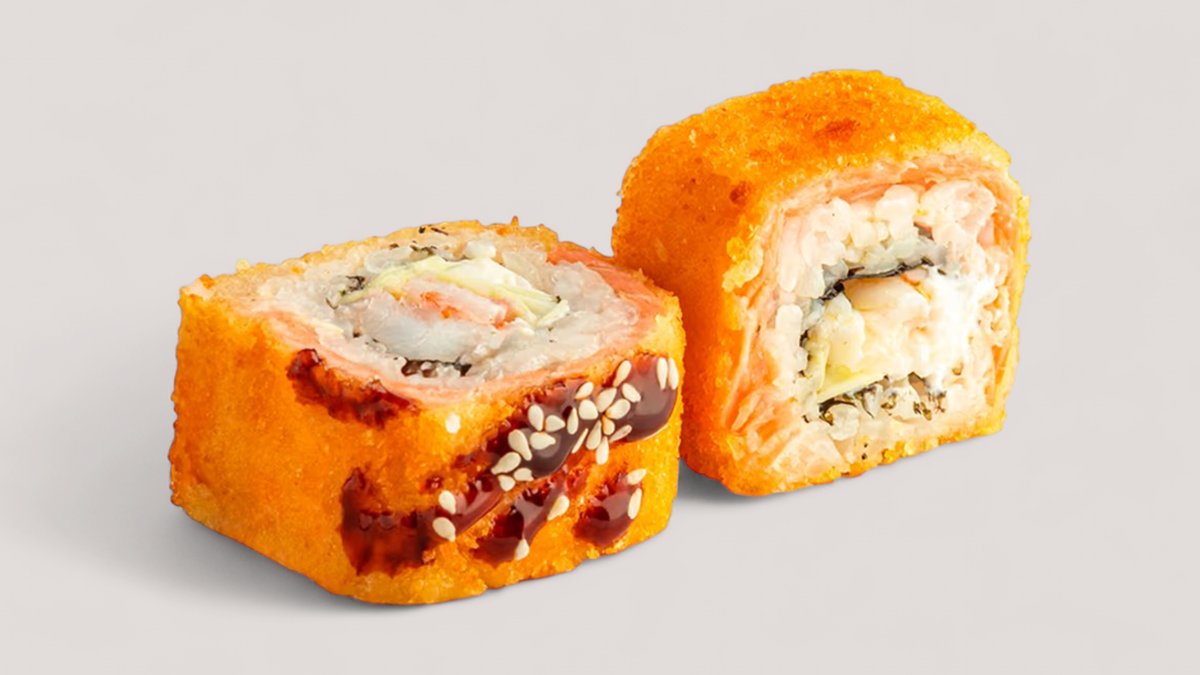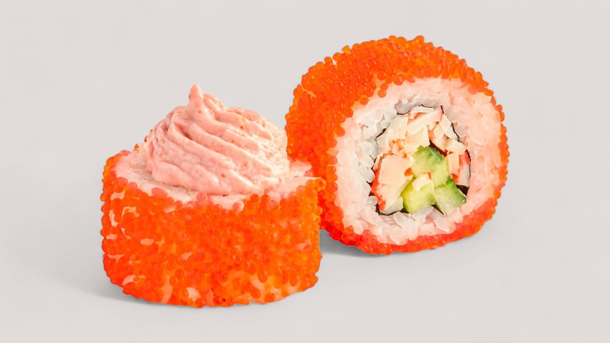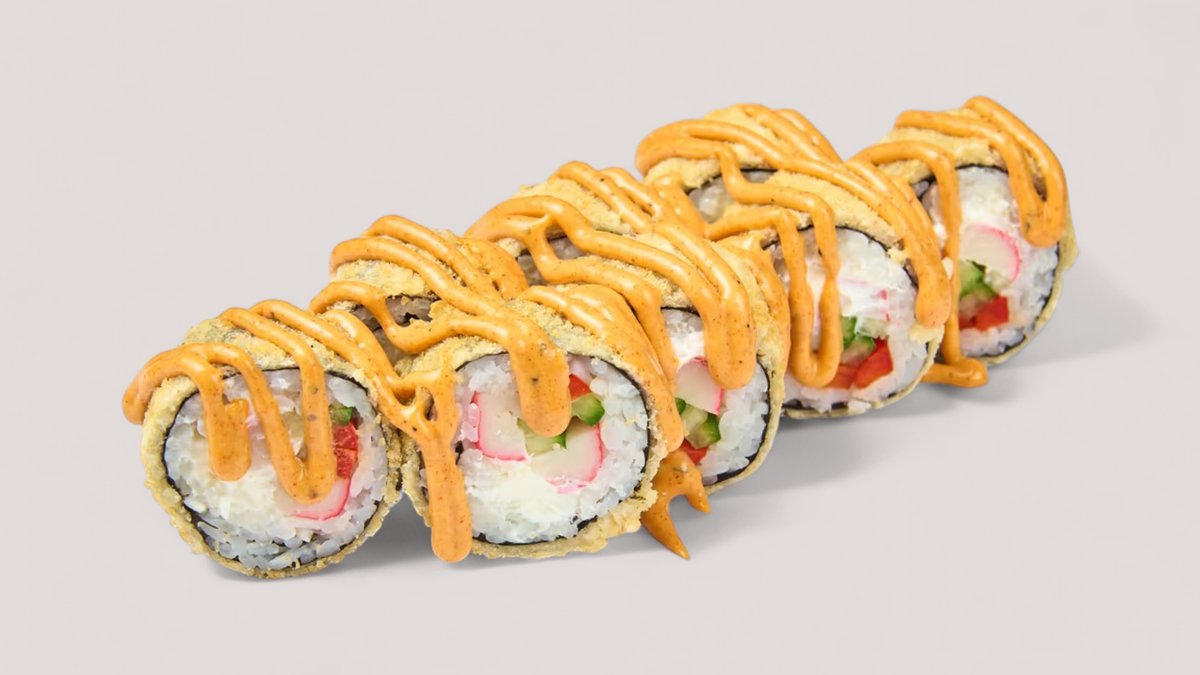 Rolnice u tempuri sa surimi (imitacija kraba), krem sirom, tobiko i masago kavijarom, krastavcem i Spajsi sosom