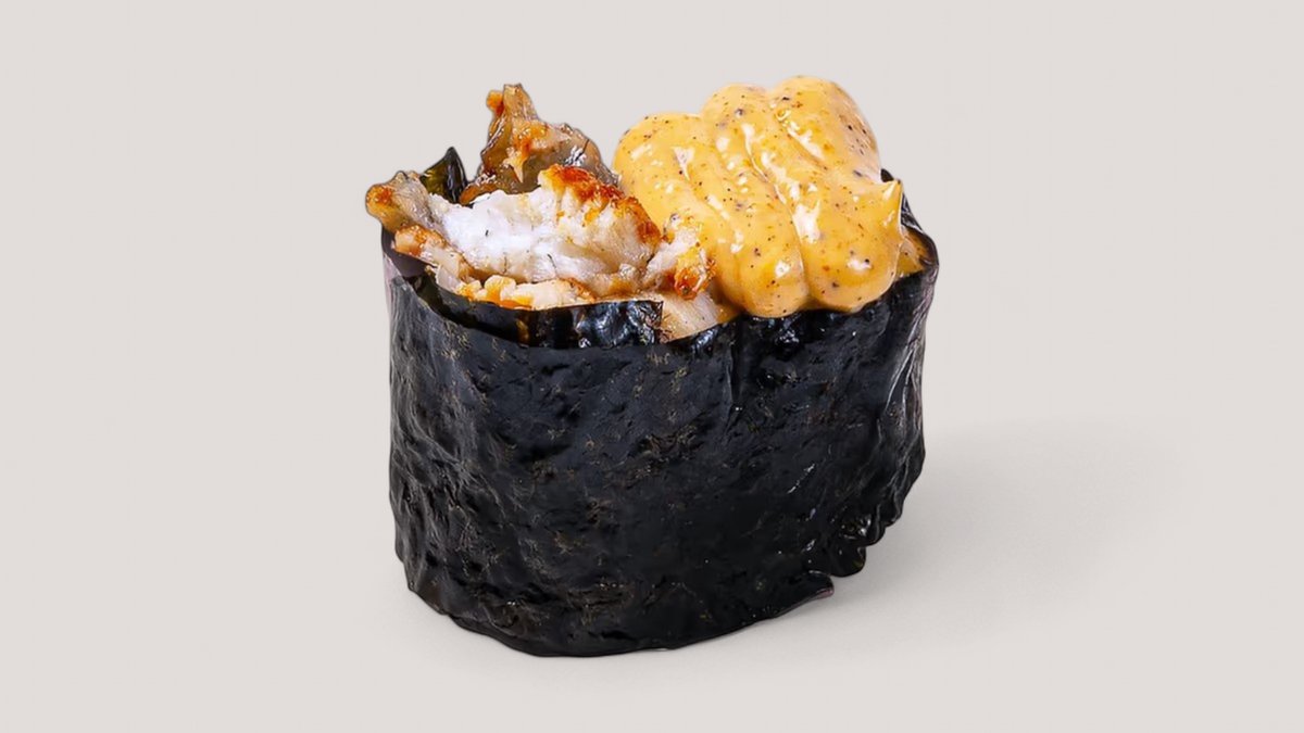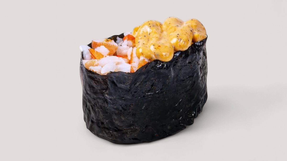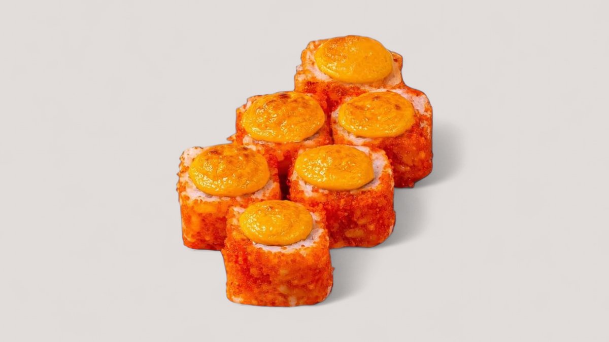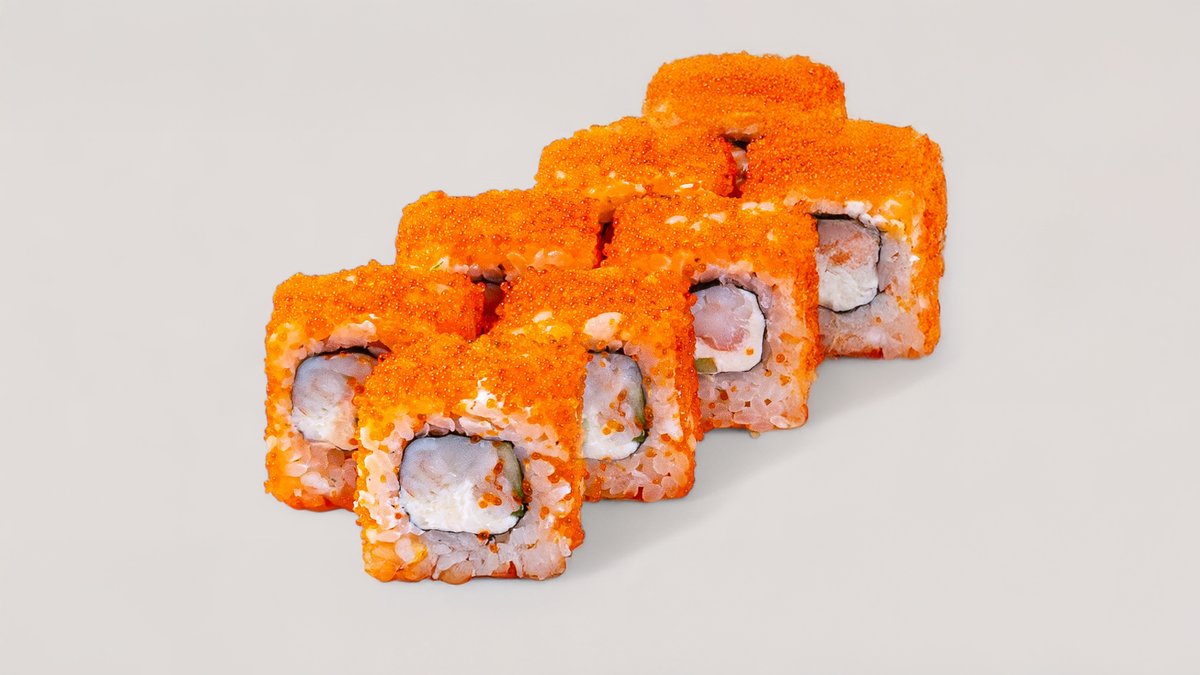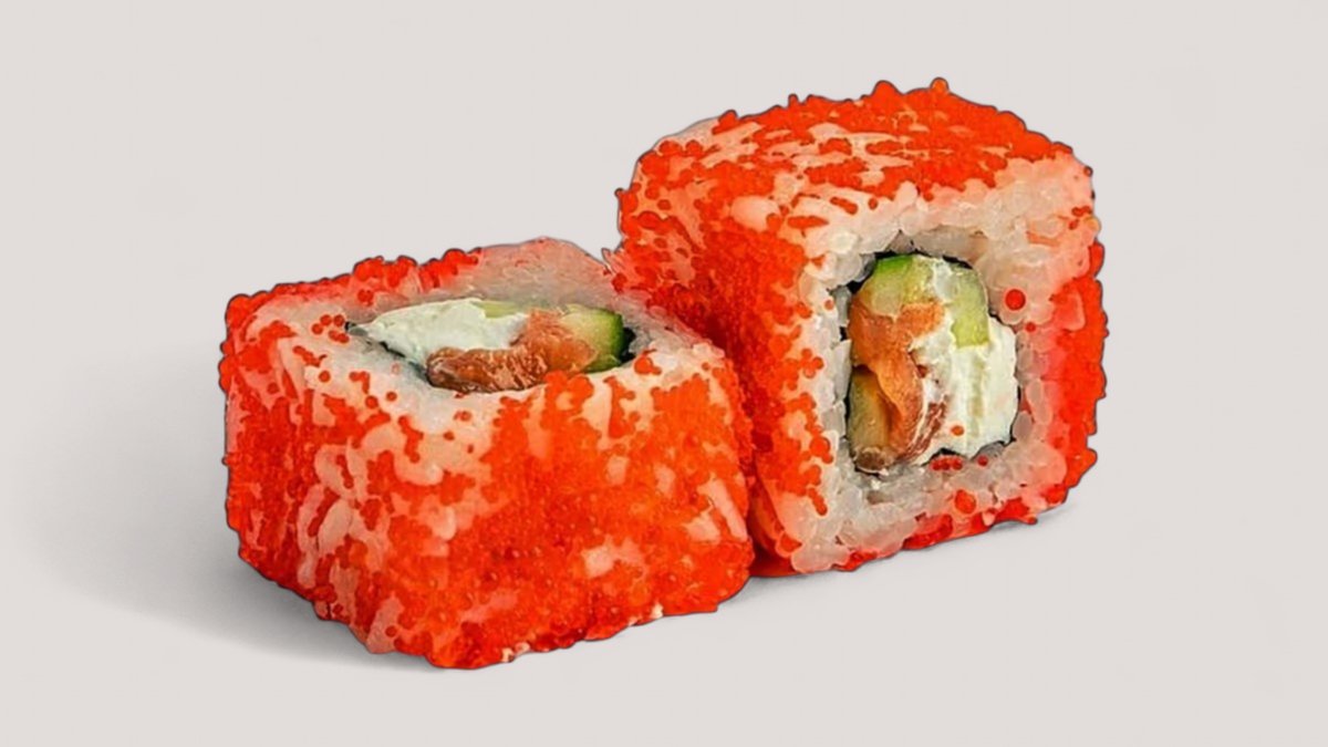 Rolnice u tempuri sa surimi (imitacija kraba), krem sirom, tobiko i masago kavijarom, krastavcem i Spajsi sosom