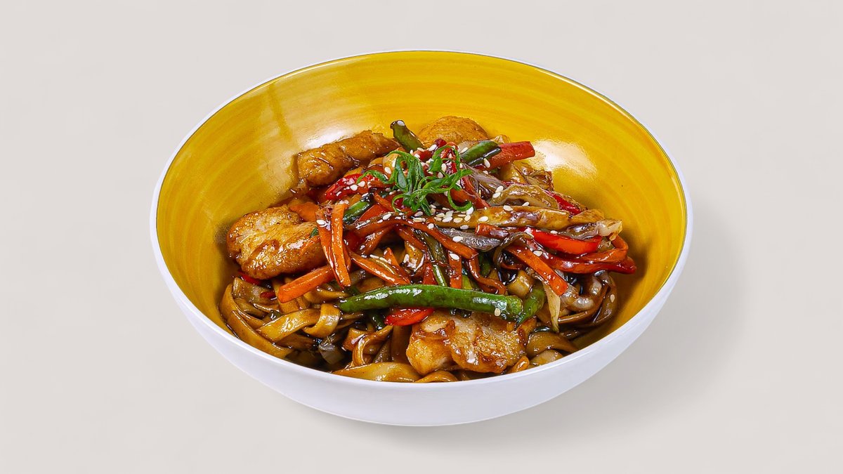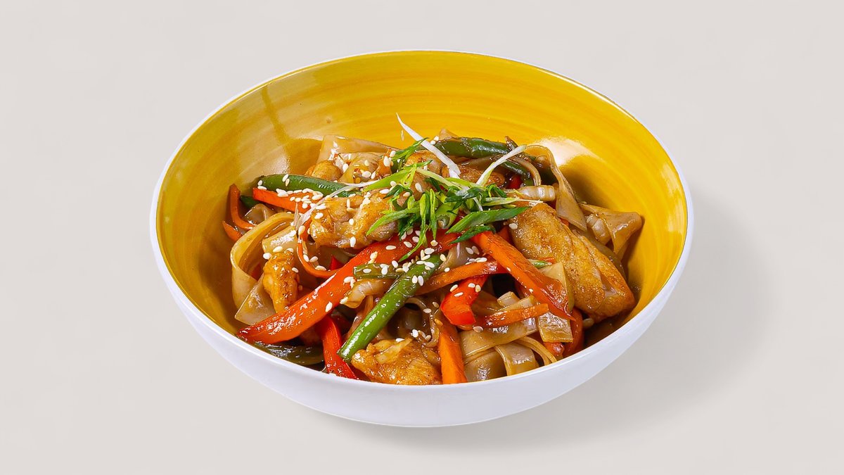 Vok s pirinčanim rezancima i piletinom u ljutоm sosu