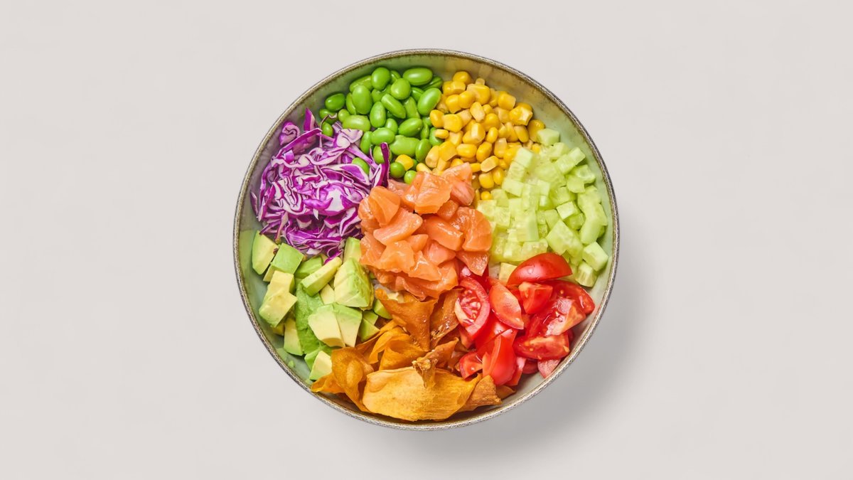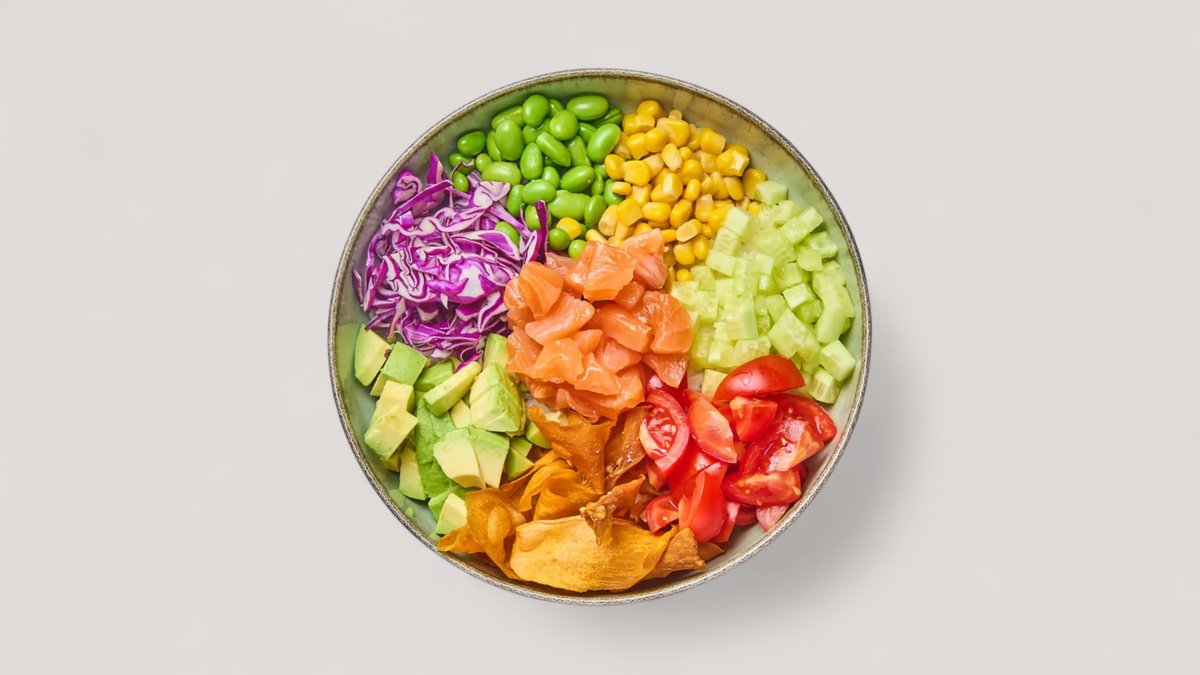 Svež losos na posteljici od pirinča, sa edamame pasuljem, kukuruzom, krastavcem, čeri paradajzom, avokadom i hrskavim čipsom od batata, posuto susamom. Sos po izboru