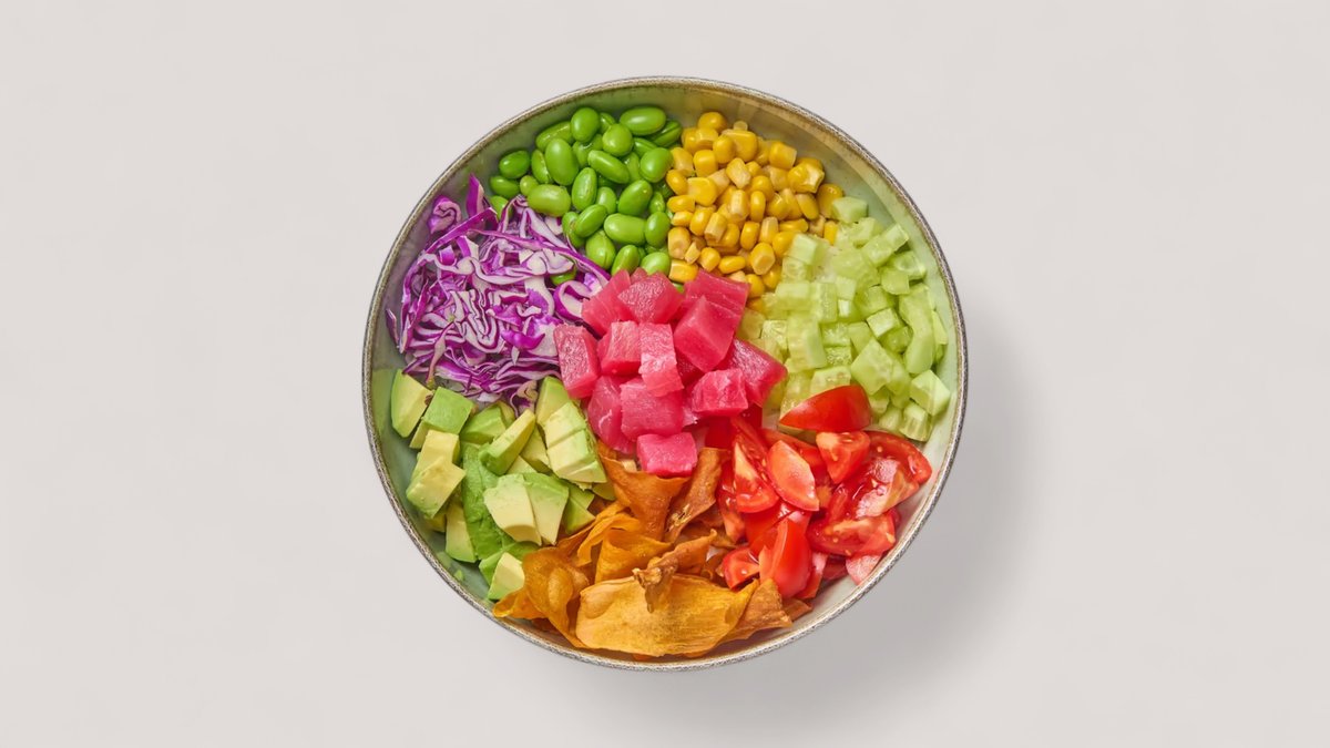 Sveža tuna na posteljici od pirinča, sa edamame pasuljem, kukuruzom, krastavcem, čeri paradajzom, avokadom i hrskavim čipsom od batata, posuto susamom. Sos po izboru.