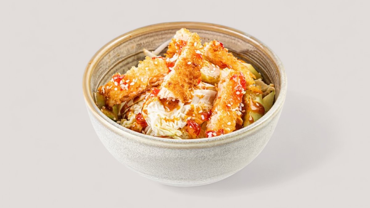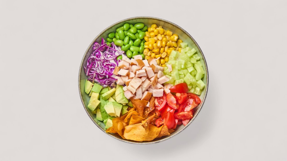 Sočna dimljena piletina na posteljici od pirinča, sa edamame pasuljem, kukuruzom, krastavcem, čeri paradajzom, avokadom i hrskavim čipsom od batata, posuto susamom. Sos po izboru.