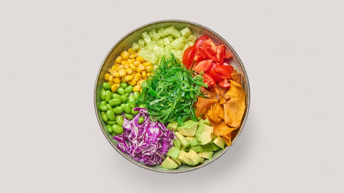 Osvežavajuća čuka salata na posteljici od pirinča, sa edamame pasuljem, kukuruzom, krastavcem, čeri paradajzom, avokadom i hrskavim čipsom od batata, posuto susamom. Sos po izboru.